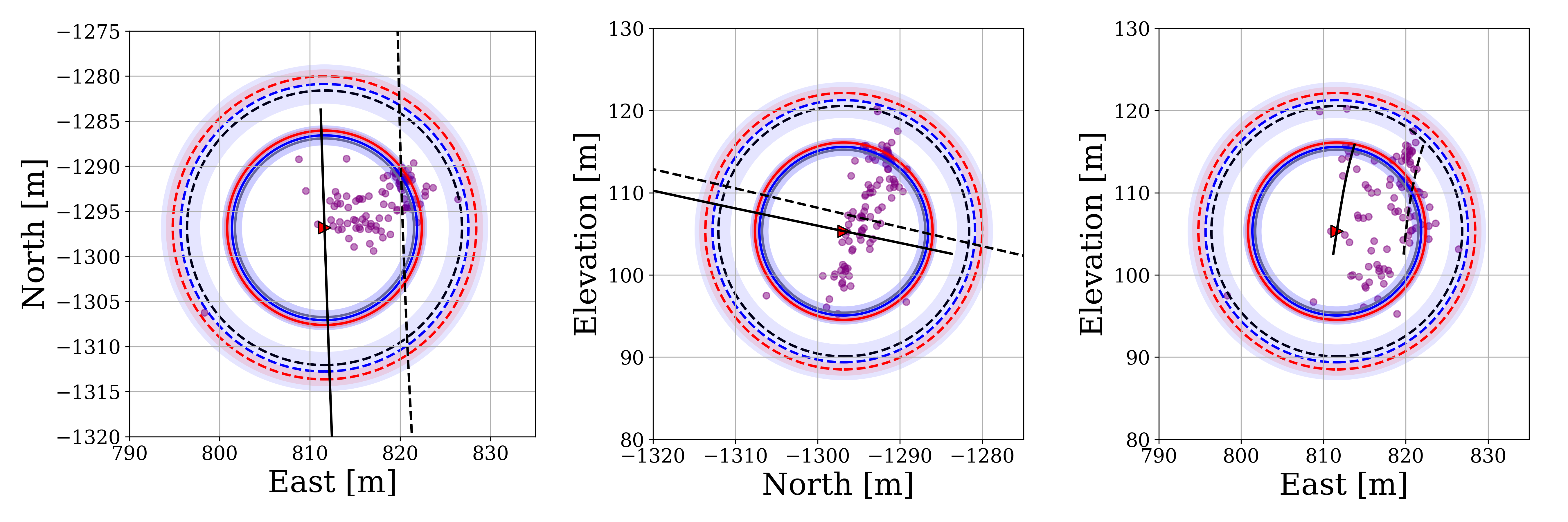 Figure. Spatial evolution of microearthquake (MEQ) clouds and forecast performance (The black solid line is the injection well; the red triangle is the injection point; the dotted line is the production well. Black solid circles are observations from monitoring data; blue and red solid circles are 1-second and 15-second forecasts, respectively. Black, blue, and red dotted circles denote P95 observation, 1-second forecast, and 15-second forecast.)
