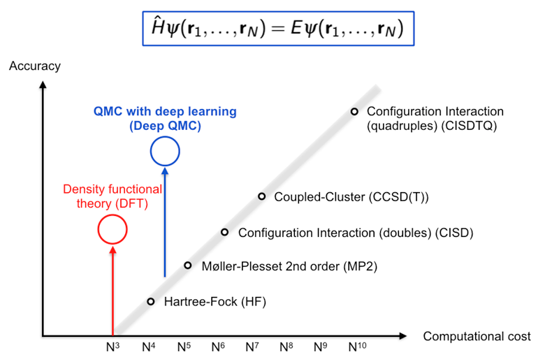 This brings us to the question of the tradeoff between accuracy and computational cost, which is omnipresent in computational chemistry. The full configuration-interaction (FCI) method can solve the electronic Schrödinger equation exactly in principle—with the accuracy limited only by the basis-set size—but at the price of being so computationally demanding that calculations on molecules with more than 20 electrons become unfeasible. In contrast, the Hartree–Fock method is relatively cheap, but also inaccurate, sometimes catastrophically so. The most successful methods are the outliers in this trend, density functional theory (DFT) being perhaps the best known example. Of all the potentially exact methods, variational QMC offers very slow scaling of computational cost with system size, and now with the help of deep learning, it can also reach superb accuracy. We believe that PauliNet, FermiNet, some combination of the two, or rather deep QMC in general, will become another outlier in terms of computational efficiency next to DFT.
