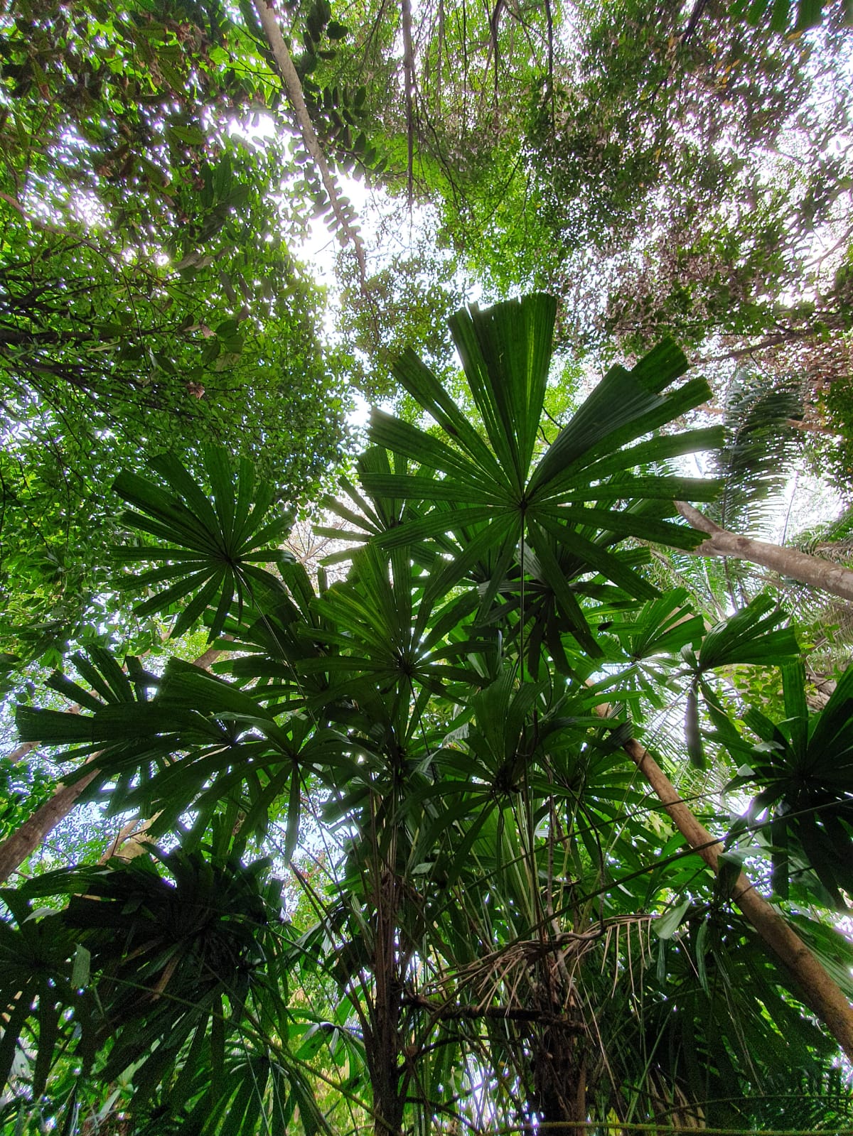 Growing up in Singapore, I found the lowland forests replete with palms of the climbing variety -- the rattans -- but most of which were indistinguishable to me except in their variation in their size and how spiny they were. Nevertheless, I felt like I could travel the tropics of the world every time I was on the bus to school. Palms from all over the world lined the streets and were on street corners. I knew not whence they came, but they certainly were not anything like the palms I saw in local forests, ranging from the beautiful fan-shaped leaves of Licuala grandis from the Pacific, to the incredible silver leaves of the stout Madagascan, Bismarkia nobilis, to the curiously foxtail-like fronds of Wodyetia bifurcata from the northern rainforests of Australia.