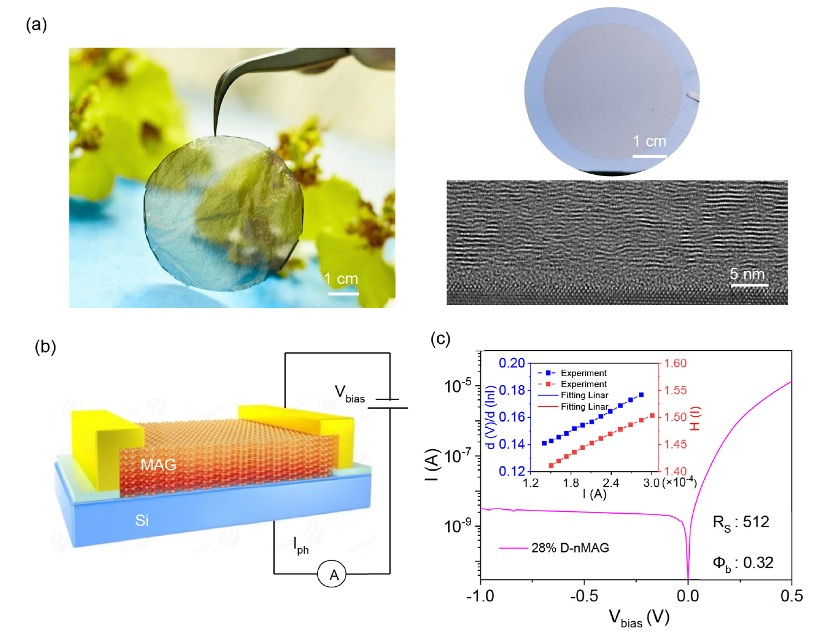 With the continuousadvancement of materials and device structures, infrared photodetectors have been effectively used in industry, science, the military, and daily life. Nevertheless, as the demand for practical applications evolves, researchers are engaged in finding new materials and integrating them with existingplatforms to push the limits of the energy efficiency of conventional infrared photodetectors. For instance, III-V semiconductor (e.g., InAs, GaAs) quantum dots and quantum-well-based structures revolutionalized high-performance infrared photoelectric detection. Nevertheless, the spectral range for photodetection is limited by the bandgap of the quantum dots or the quantum well. The response time is tens of milliseconds or even up to a few seconds because of the slow chargediffusion process. Although III-V semiconductor-based photodetectors have extended the detection bandwidth to the mid-infrared range, these junctions still suffer from low detection rates (D*), especially at room temperature. In addition, ill-defined barrier heights and Fermi level pinning due to metal-induced gap states further worsen the signal-to-noise ratio (SNR). Recently, considerable works have been reported around carbonbased optoelectronics due to the unique physical structure, chemical stability, and green synthesis of carbon materials. Graphene is considered one of the most promising candidates for optoelectronic materials for its superior optical and electrical properties. Single-layer graphene (SLG) shows only 2.3% light absorption, limiting its application in infrared detection. Our previous work proposed a macro-assembled graphene nanofilm (nMAG) with uniform and controllable thickness and high crystalline orientation through a wafer-scale preparation process. The nMAGs raise the light absorption to 45% in the wavelengthranging from 2 to 10μm and drastically broaden the detection range of graphene-based infrared detectors. However, the fabrication of highly crystallized AB-stacked nMAG required high-temperature thermal treatment (2 h of sintering at 2800 ◦C in the argon atmosphere), which significantly increases energy consumption and production cost. Nevertheless, nMAG/Si suffers from low photodetection. Recently, some works have reported that trapped carriers can be thermally reexcited to the conduction band (CB) or valence band (VB) of the materials, thus leading to the re-establishment of carrier equilibrium and the gain of the photocurrent. It is difficult to tune the defect states for conventional bulk materials because the modulation of semi conductor trap states is mainly concentrated on surface/interface treatments. 2D materials afford an excellent platform to explore these issues because their electronic properties can be flexibly modulated by defect and interface engineering to attain a high photo electric transformation rate. Numerous techniques have trig gered defect engineering in 2D materials, including electron beams (e-beams), plasma, chemical treatment, ozone, and laser. To further improve the infrared detection performance of the carbon-based device, we modulate the material structure to evaluate the effect of material defect states on device performance.