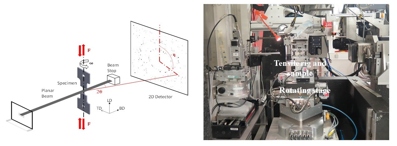 This study focuses on understanding the mechanisms that control formation and annihilation of twins in HCP alloys. Since engineering components are often exposed to cyclic loads, we decided to design an experiment where we would apply both compression and tension loads on the same specimen. This was very challenging because (a) we were required to rotate our magnesium and zirconium specimens 360 degrees to measure 3D diffraction patterns, (b) we needed to ensure that the specimens would not buckle under load and (c) we needed to avoid unmounting the specimens during load-unload-reload steps. The set-up of our experiment at the European Synchrotron Radiation Facility (ESRF) is shown in figure below.