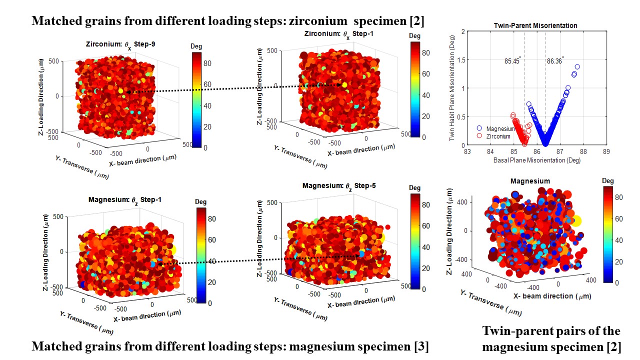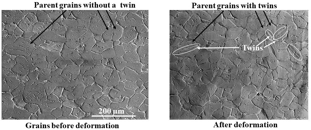 The plastic response of an HCP alloy is generally controlled by two main mechanisms: slip which is the movement of line defects on particular plane and direction, as well as twinning which is reorientation of portion of a crystal. Characterizing formation of twins is challenging because unlike slip, twinning is a rapid process. In addition, once formed, with further loading twins thicken and grow in size while with reverse loading, they reduce in size and annihilate. Figure below shows an image of zirconium grains before and after deformation where several needle-shape twins and their parent grains are identified.