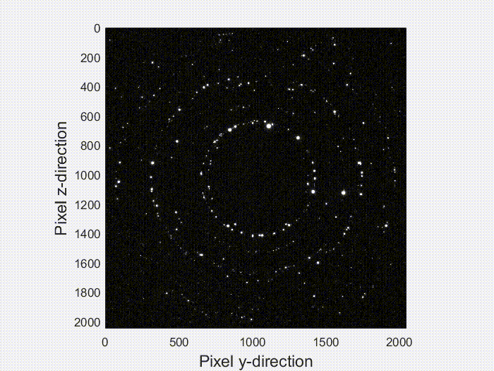 To check when our specimens would buckle, we started our ex-situ experiments two days before the actual in-situ ones. We spent some time breaking a couple of specimens to understand when and how our specimens may buckle in an actual in-situ set-up. We started our experiments on day 3 and over the next 6 days we collected more than 4TB of diffraction data which needed lots of post-processing. An example of collected diffraction patterns for a rotating specimen is shown below.