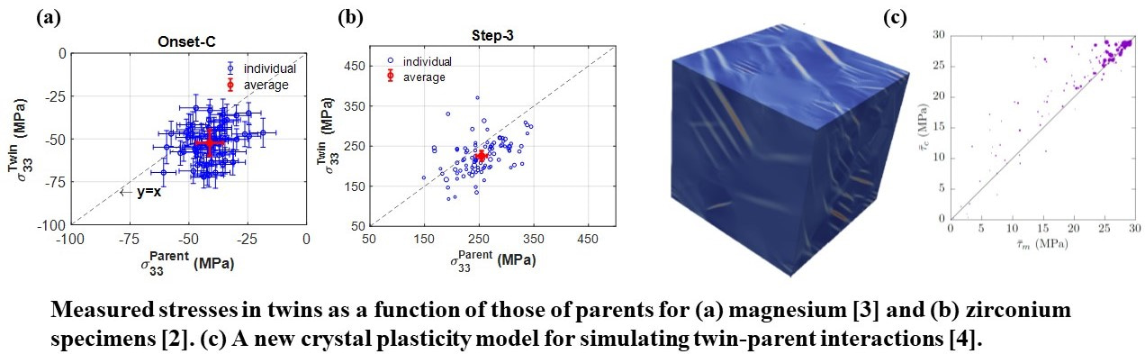 The analysis of collected data showed that we captured twin and parent pairs in both magnesium and zirconium specimens. The figure above shows the indexed grains for the first and last loading steps of each specimen, and the results of our post-processing methods for matching grains as well as determining twin-parent pairs. We studied the relationship between the stress in the twin and that of parent grain and we realized that when twins are small (thin), they are nearly as stressed as their corresponding parent in the zirconium case. In the magnesium case, the twins were more stressed than their parents. To further understand the reason for the observed behavior, we used crystal plasticity modeling to simulate the local interaction between twin-parent pairs by developing a novel numerical model that can capture real twin geometry-see figure below. Our numerical modeling show that in the magnesium case because the twins were formed under compressive force and because their crystal c-axis were parallel to the loading direction, minimum plasticity was observed in the twins and hence twins are hard. In addition, our experiment show that with further loading and twin thickening, twins relax. One important conclusion we had from the load reversal experiment was that twins do not necessarily annihilate when the driving force in the parent is negative and part of the driving force is actually originating from the twin itself.