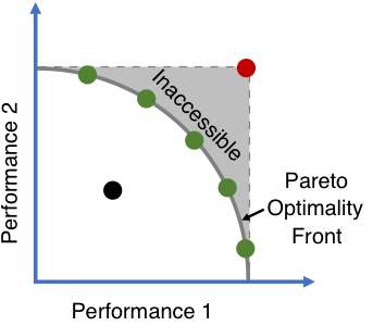Imagine a two-dimensional fitness space, with each dimension representing fitness in one environment or performance of one trait (Figure 2). The fitness space is constrained by a trade-off curve (or Pareto front) that prevents any individuals from maximizing both traits simultaneously (the red dot) and separates the evolutionary accessible space from the inaccessible space (note that the Pareto front could take different shapes, e.g. concave, convex and linear). If the evolutionary ancestor starts on the Pareto front (green dots), improving one trait would come at the cost of decreasing performance in another. By contrast, if the ancestor is located behind the Pareto front (the black dot), it would be able to improve both traits until the front is reached. The fact that some clones were able to improve both or all performances indicated that the ancestor was indeed located behind the Pareto front if one existed (same as evolutionary ancestors used in previous studies). In this case, defining trade-offs by comparing to the wild-type ancestor, as commonly practiced, can be misleading. Instead one must map out the performance space by sampling a large number of adaptive clones selected under different conditions enabled in this study. The existence of trade-offs would be supported by the existence of the Pareto front and the existence of the evolutionary inaccessible space.