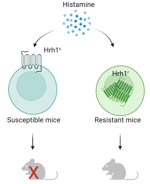 In mice, we previously identified Histamine 1 receptor (H1R/Hrh1) as the gene regulating susceptibility to Bordetella pertussis-induced histamine sensitivity. H1R has two haplotypes in mice with the Hrh1s allele imparting hypersensitivity and the Hrh1r allele mice are resistant to histamine.