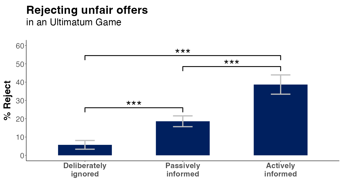 Fig. 1: Informational States and Rejections of Unfair Offers. In line with our hypothesis, we found a significant difference in the mean rejection rate of deliberately ignorant (6%) and actively informed (39%) responders. Responders who passively received information rejected 19% of offers. Follow-up analyses revealed significant differences between all three informational states (*** p < 0.001). Contrary to our expectation, the average rejection rate of deliberately ignorant and actively informed responders (21%) did not significantly differ from the rejection rate of passively informed responders. Error bars represent 95% confidence intervals.