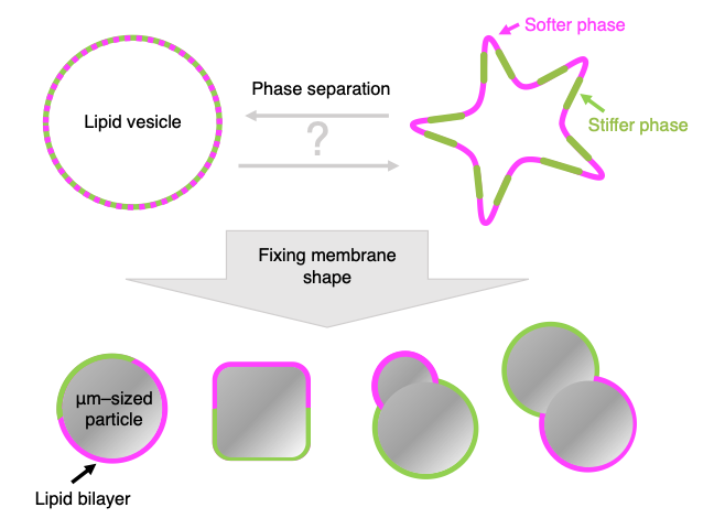 To solve this chicken-and-egg-problem, the authors have fixed the membrane geometry to specific shapes. In this way, they can understand how geometry influences phase separation patterns. In the experiments, they use micrometer-sized particles that are spherical, cubic, dumbbell, and snowman-shaped, which are covered with a multicomponent lipid membrane that fully envelops the particles.