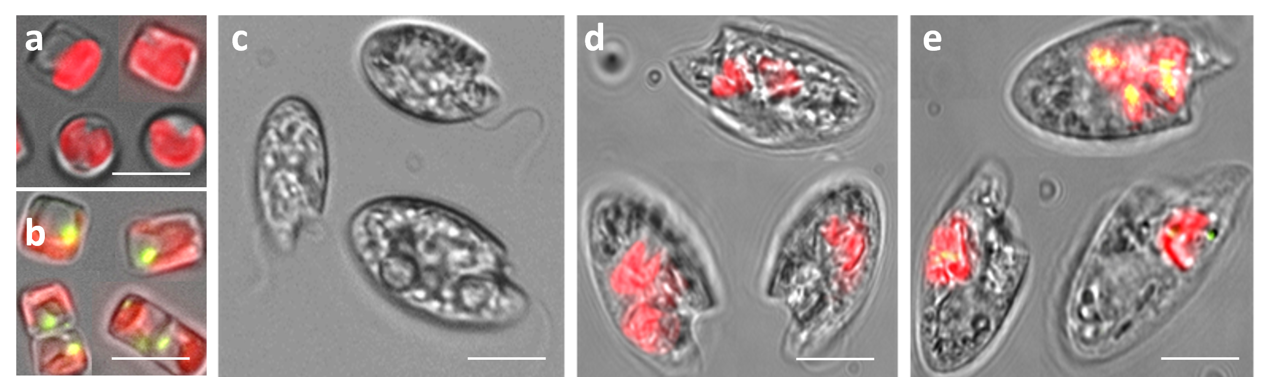 Model phytoplankton and microzooplankton used in the lab. a, Wild-type T. pseudonana. b, transgenic T. pseudonana. c, O. marina. d, O. marina with ingested wild-type T. pseudonana cells. e, O. marina with ingested transgenic T. pseudonana cells. Red represents T. pseudonana’s chlorophyll fluorescence. Yellow-green represents the expressed DMSP lyase enzyme in the transgenic cells (the Alma1 sequence was conjugated to GFP). Bar = 2 µm for a,b and 5 µm for c-e.
