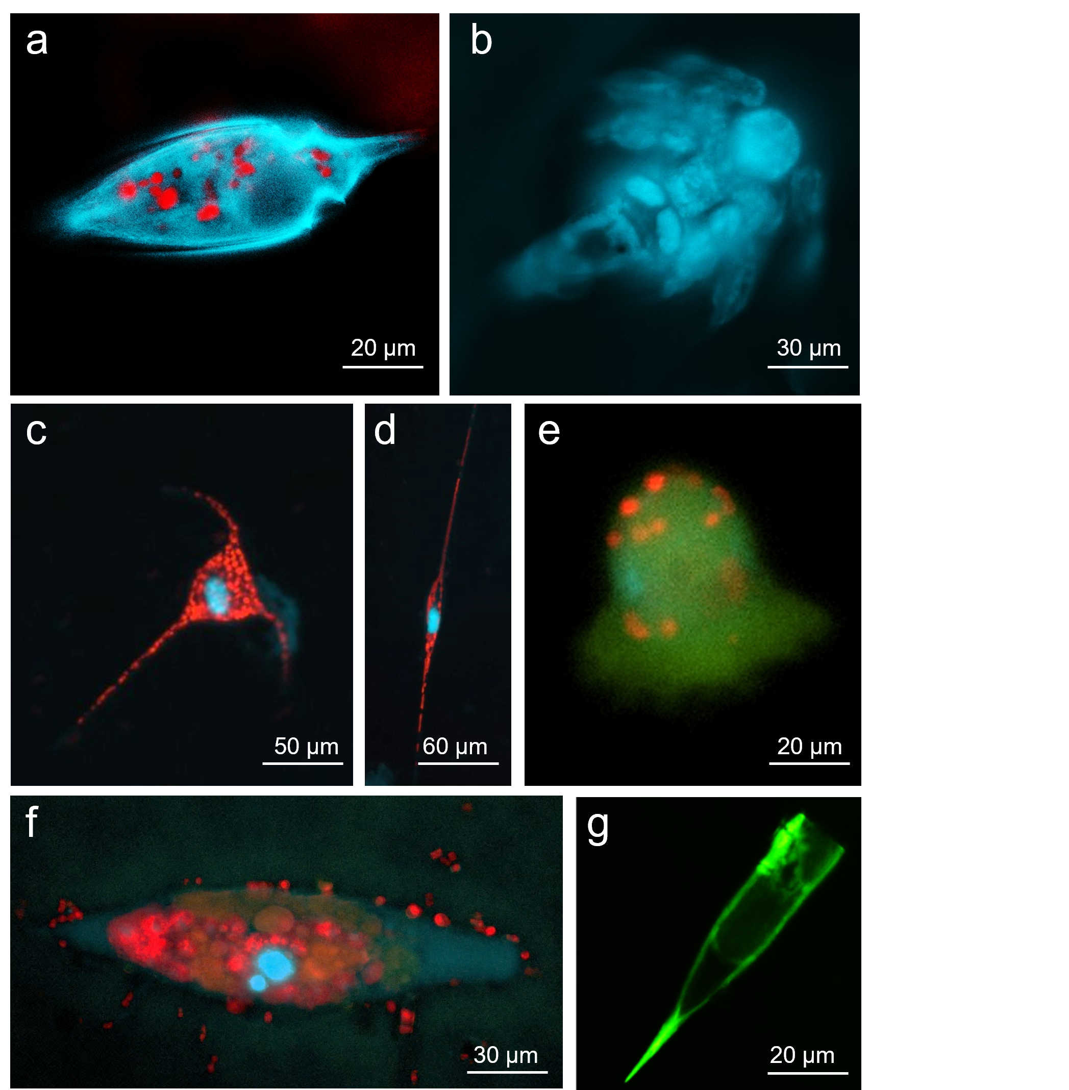 Microzooplankton, the major consumers of phytoplankton biomass in the ocean. Fluorescent micrographs of natural microzooplankton collected from the Red Sea. a, A dinoflagellate b, A copepod nauplius. c-d, Two Ceratium dinoflagellates. e, A tintinnid ciliate. f, The ciliate Tiarina. g, A tintinnid ciliate. Red represents the chlorophyll of ingested phytoplankton cells, but may also represent endogenous chloroplasts, as in mixotrophic species (c,d), or symbiotic microalgae, as in (f). DAPI nuclear stain (blue) and DiOC6, a general membrane stain (green) were used to visualize the cells.
