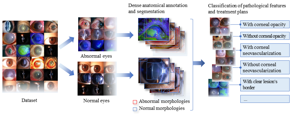 Inspired by genome sequencing, we combined genomics with computer vision, and developed a novel annotation technique named “Visionome”, to establish a densely annotated dataset, based on anatomical and pathological segmentations. In our study, a total of 1,772 slit lamp images of patients with infection-related diseases, age-related diseases, and environment-related diseases were processed by Visionome.