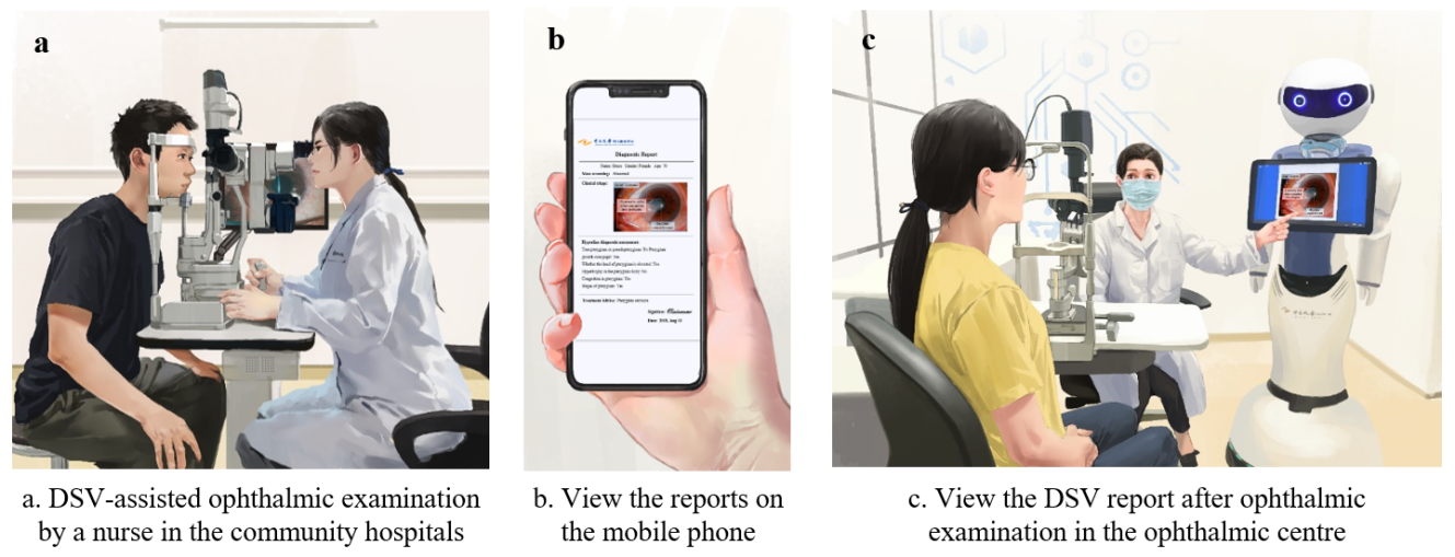 Although the system performed well during internal validation, it was not convincing enough for clinical application. Therefore, we further designed retrospective external validation tests and a prospective test to compare the performance of the DSV with ophthalmologists and to assess the capability of the DSV in real-world clinics. We also established a website to perform these tests and provide patients with remote real-time monitoring of disease conditions. Our system had performance similar to ophthalmologists across four clinically relevant retrospective scenarios, and correctly diagnosed most of the consensus outcomes of 615 clinical reports in prospective datasets for the same four scenarios. When facing diseases that the machine had not learned, including the top 10 eye emergencies, and other common complex diseases, the diagnostic ACC of the mass screening scenario was 84%, demonstrating the adaptability of Visionome.