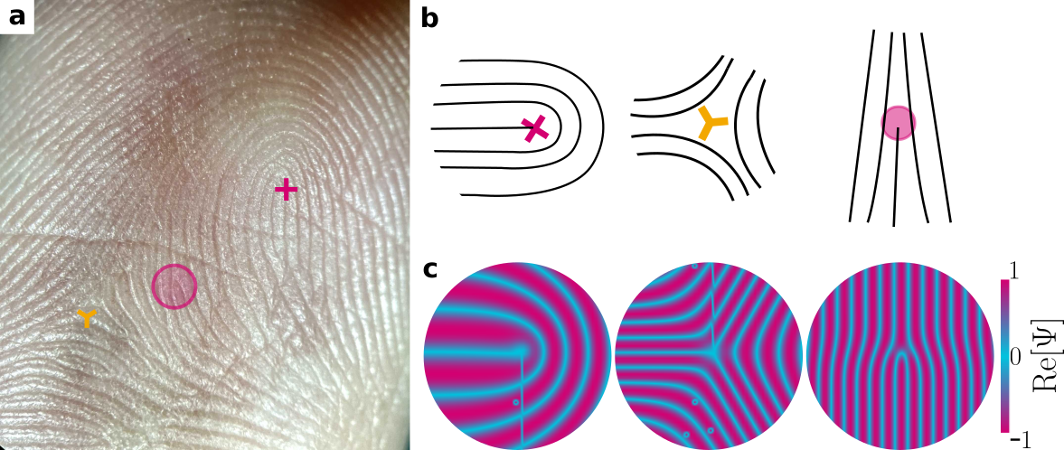 A catalogue of defects in 2D smectics. (a) Single defects marked on a high-resolution photo of a fingerprint. +1/2 disclination-type defect, -1/2 disclination-type defect and edge dislocation marked by a red cross, yellow trilateral and red circle, respectively. (b) Schematics of (left) +1/2 disclination, (centre) -1/2 disclination and (right) dislocations type defects. (c-e) Simulations of defects in circular domains with boundary conditions requiring single defects. These match the schematics in (b) and show a visualisation of the layers from the eigendecomposition of the complex tensor order parameter.
