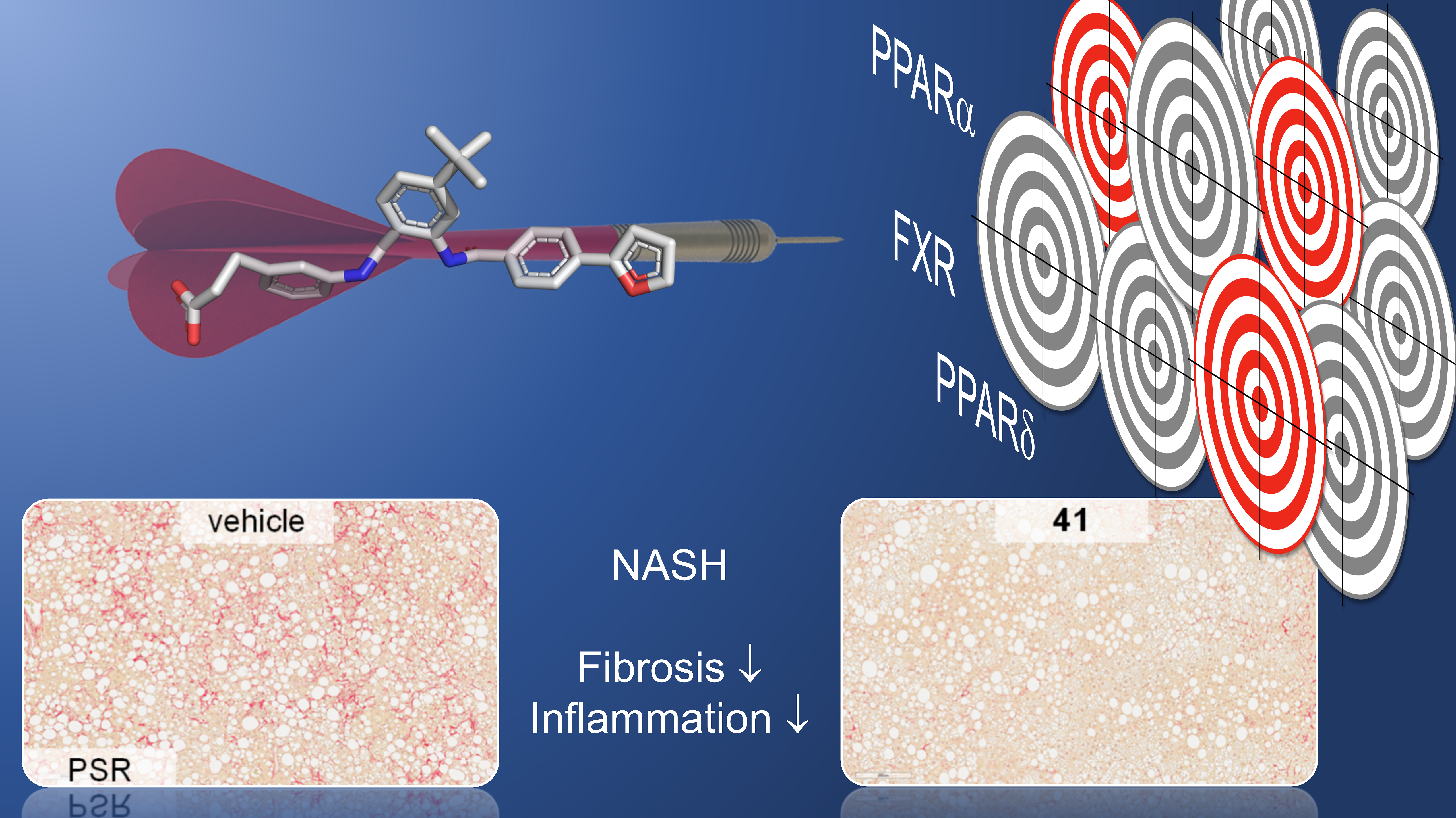 In diet-induced obese (DIO) mice as widely accepted NASH model, we found that after treatment for twelve weeks, the triple partial agonist had no pronounced effects on steatosis. We reason that full FXR agonism (19% FXR activation compared to literature full agonist GW4064) might be required to reduce hepatic steatosis. Nevertheless, 41 decreased lobular inflammation levels and robustly improved fibrosis markers. Remarkably, these anti-fibrotic effects were superior to a previously reported study which combined OCA and elafibranor treatment in an equivalent NASH model. Moreover, unlike drug combinations, a single polypharmacological drug has a well-defined pharmacokinetic profile and avoids unwanted drug-drug interactions.