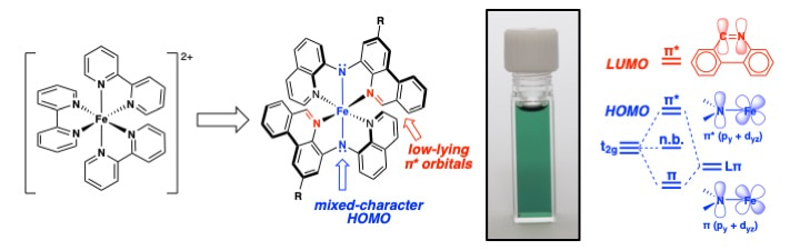 Our group is interested in how ligand design can be used control the photophysical properties and reactivity of late transition metal coordination complexes. In particular, we have focused on benzannulated N-heterocyclic ligands that can defy conventional understanding of how extending a ligand’s pi-system might impact absorption/emission.[3,4] During these investigations, we found that installing ligands which pair benzannulated heterocycles with amido donors on iron(II) formed deep green coordination complexes with absorption profiles covering from the ultraviolet to the edge of the visible.