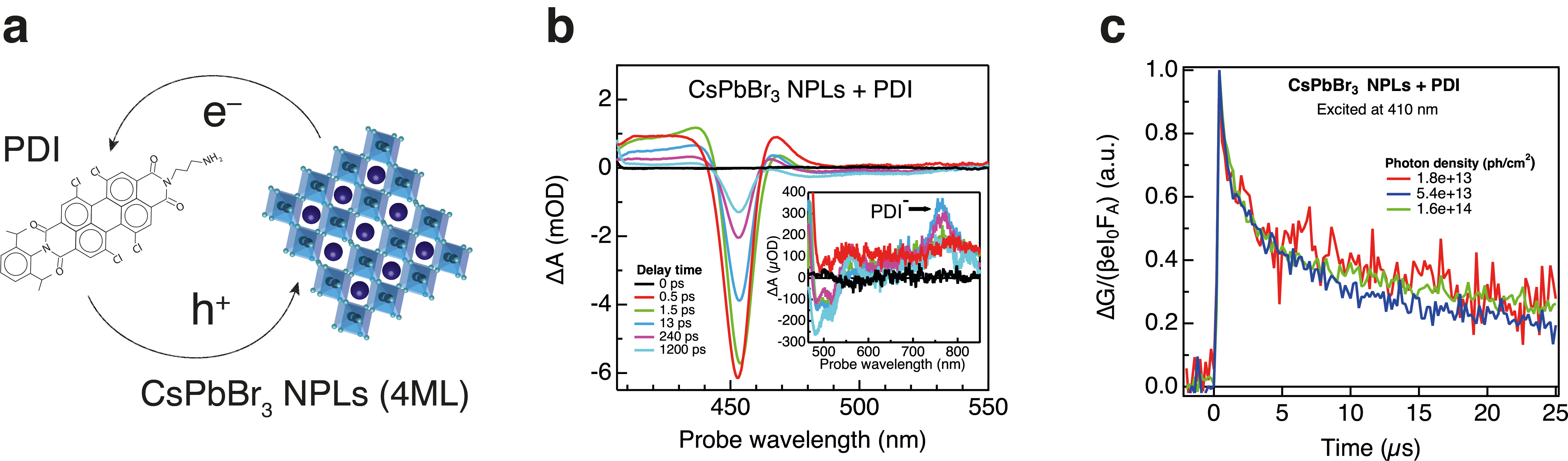 This idea is the basis of our recent work at the Delft University of Technology, in which we attached organic peryline diimide (PDI) chromophores to 2D CsPbBr3 nanoplatelets observing striking changes in the optoelectronic properties and charge carrier transport due to charge transfer in the material. We determined by transient absorption (TA) experiments charge transfer efficiencies of ~50% from both the nanoplatelets to the PDI (electron transfer) as well as from the PDI to the nanoplatelets (hole transfer) by selectively exciting each compound (Fig. 2a). The charge transfer is unequivocally proven by the appearance of the characteristic absorption feature of the PDI chromophore when it has accepted an electron (PDI anion) at 760 nm (Fig. 2b). In addition, we demonstrated that the charges formed in this way live long enough to be useful for application in devices such as solar cells (Fig. 2c, microsecond lifetimes). Further work should aim to optimize the charge transfer efficiency by varying the energy levels using different nanoplatelets thicknesses and organic chromophores, beside designing organic chromophores that would strongly interact to couple their orbitals and conduct.
