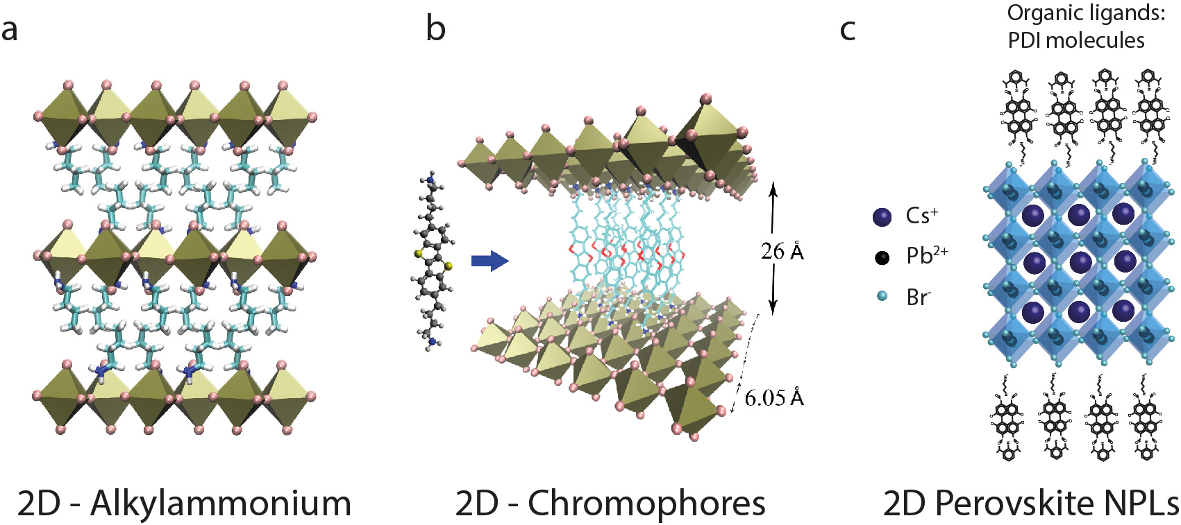 In 2D perovskites with non-functional organic compounds, the electronic charges (electrons and holes) are limited to the inorganic octahedral layer where they strongly interact through electrostatic interaction between the positive and negative charge (~350 meV), resulting in a strongly bound charge pair at room temperature. This property is desirable for light-emitting applications but not for solar cells and photo-catalyzers were charge separation is required. Our first idea consisted of trying to induce charge separation by introducing functionally strong electron acceptor or donor organic chromophores (such as perylene diimides, naphthalene diimides, perylene, etc.) commonly used in organic solar cells (Fig. 1b). We tested this idea by performing density functional theory (DFT) calculations finding that these large organic chromophores can be introduced to form stable 2D perovskites in which the electronic band structure is also formed by orbitals from the organic component, in principle this would be the result of charge transfer.1 However, reality is not as straightforward as computer calculations. Synthesizing these materials turned out to be very challenging.2–4 We tried many chromophores and synthetically modified them to improve their solubility in the solvents used for the inorganic elements. Nevertheless, we were not able to periodically stack the organic chromophores in between the inorganic octahedral layers. With a little inspiration from the quantum dots field, we changed the approach to overcome the stacking constraint by replacing the attached organic ligands used to stabilize colloidal 2D perovskite nanoplatelets in solution with our functional organic chromophores (Fig. 1c). This way we could create an experimental model system to study if charge transfer would occur in this material.