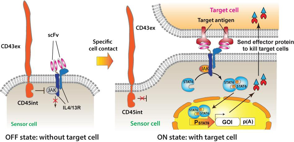 While discussing within the team to find a breakthrough solution, we changed the focus protein, and came up with an idea to conjugate intracellular domain of the protein CD45 to some inhibitory protein of a signaling pathway that is functional in non-immune cells. We thought it would be possible to control accessibility of the inhibitory protein to downstream signaling components along with biophysical segregation of CD45 triggered by cell-cell contact, thereby enabling OFF/ON switching of downstream signaling of the signal inhibitory protein upon cell-cell contact. In fact, as we looked more closely at the function of CD45, we found that it could be used as such a signal inhibitory protein, since CD45 was reported as an inhibitor not only for T cell signaling, but also for the JAK-STAT signaling pathways that function in a variety of cells5 (a fortunate finding). Thus, we came up with the basic design of the signaling device we developed, and finally this signal rewiring did work (Figure 1).