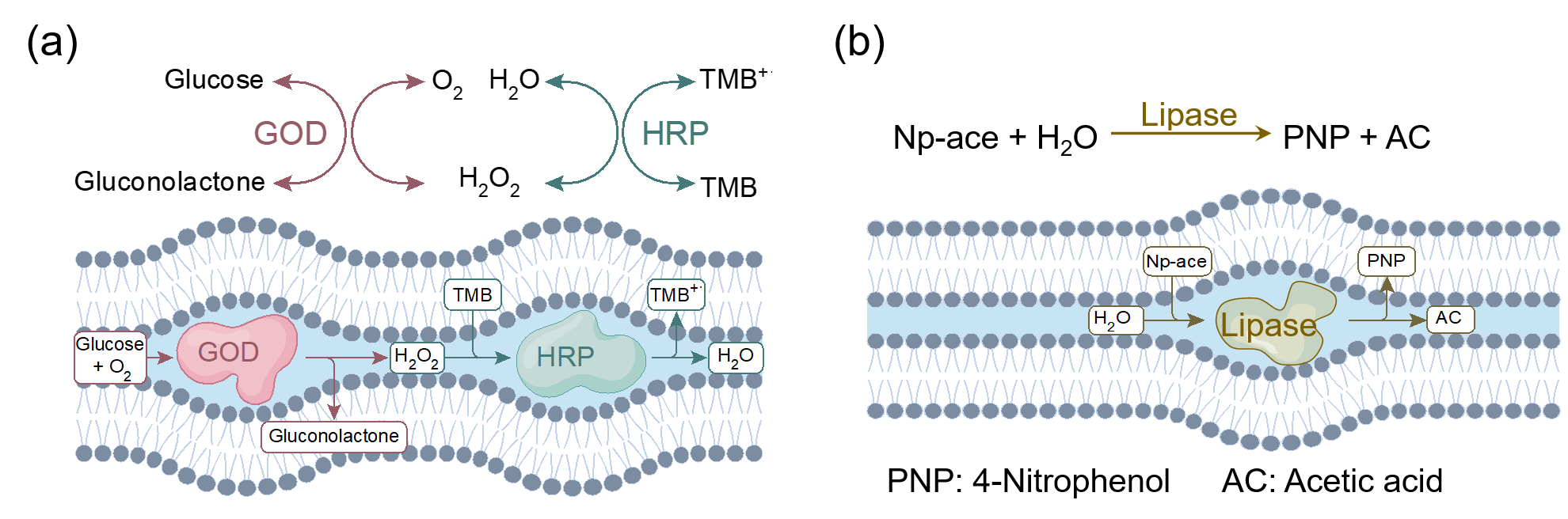 Figure 2. Schematics of GOD-HRP cascade reactions (a) and hydrolysis of Np-ace by lipase (b) confined in the lipidic mesophase.