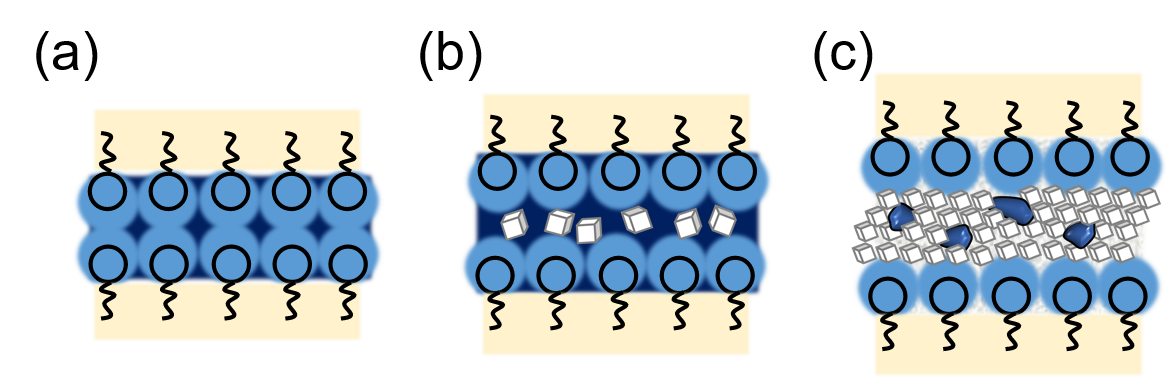 Figure 1. Schematics of water confined in Phy95-W5 (a), Phy85-W15 (b), and Phy70-W30 (c).