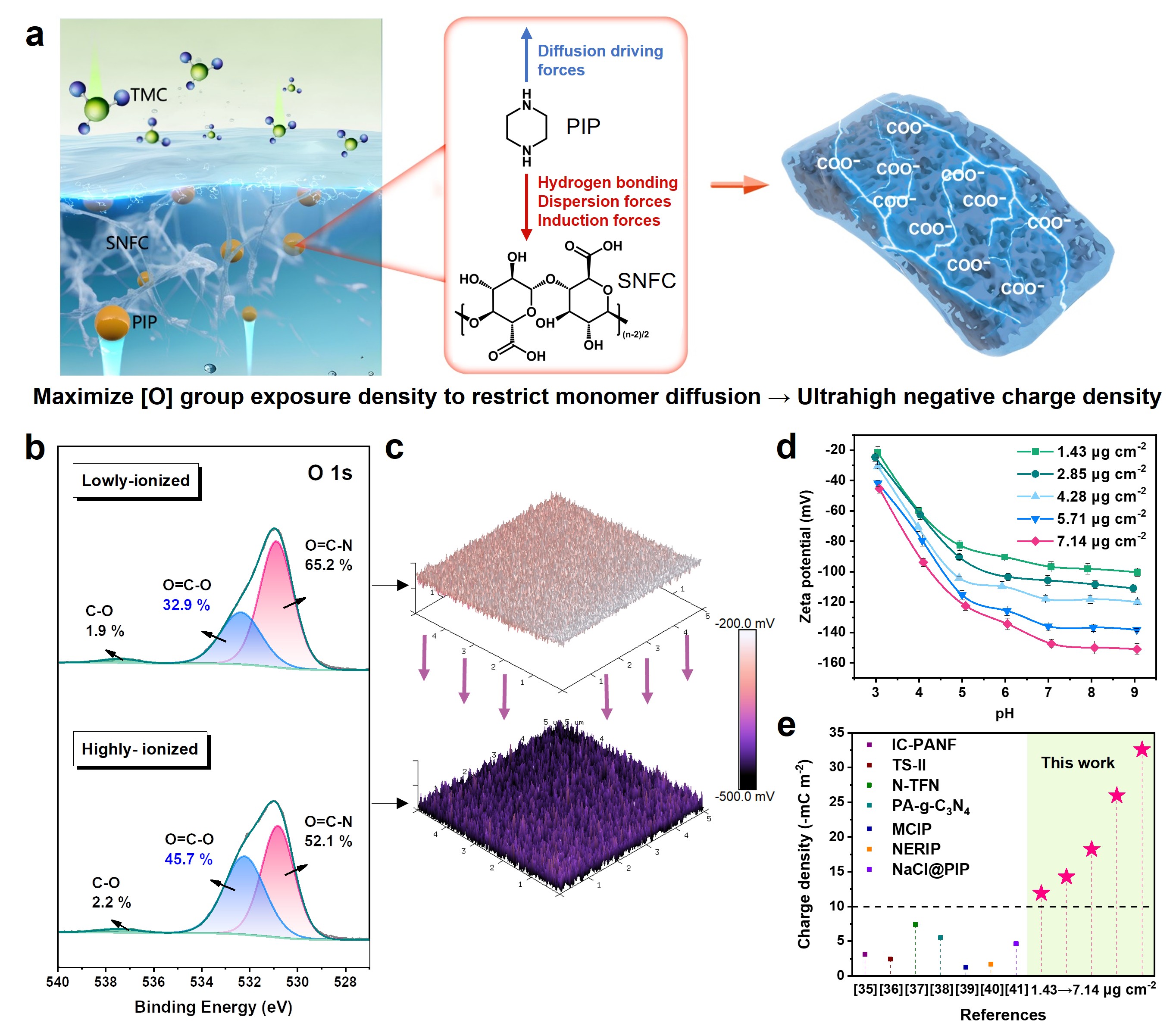 Fig. 1 Regulation and highly ionized characteristics of PA‒SNFC membranes. a Schematic illustration of highly ionized membranes. b XPS O 1s high-resolution spectra and c corresponding KPFM images of the lowly ionized membrane and highly ionized membrane. d Zeta potential of PA-SNFC membranes with different SNFC dosages. e Comparison of the charge densities of PA-SNFC and other state-of-the-art membranes.