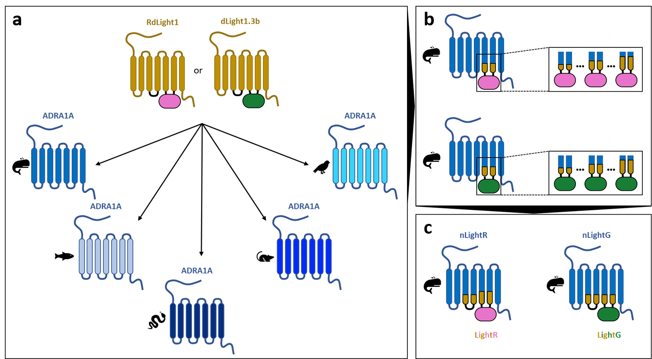 We explored norepinephrine receptors from various animal species, and interestingly, the receptor derived from the sperm whale, known for being the animal with the largest brain on our planet, yielded the most sensitive indicators (Figure 1a). To optimize the dynamic range of the generated indicators we varied the size of the grafted modules from dLight1.3b and RdLight1 (Figure 1b). Our breakthrough came when we discovered that grafting both, the fluorescent protein domain and the second intracellular loop (ICL2) of the receptor, simultaneously enhanced dynamic range and ligand selectivity (Figure 1c).