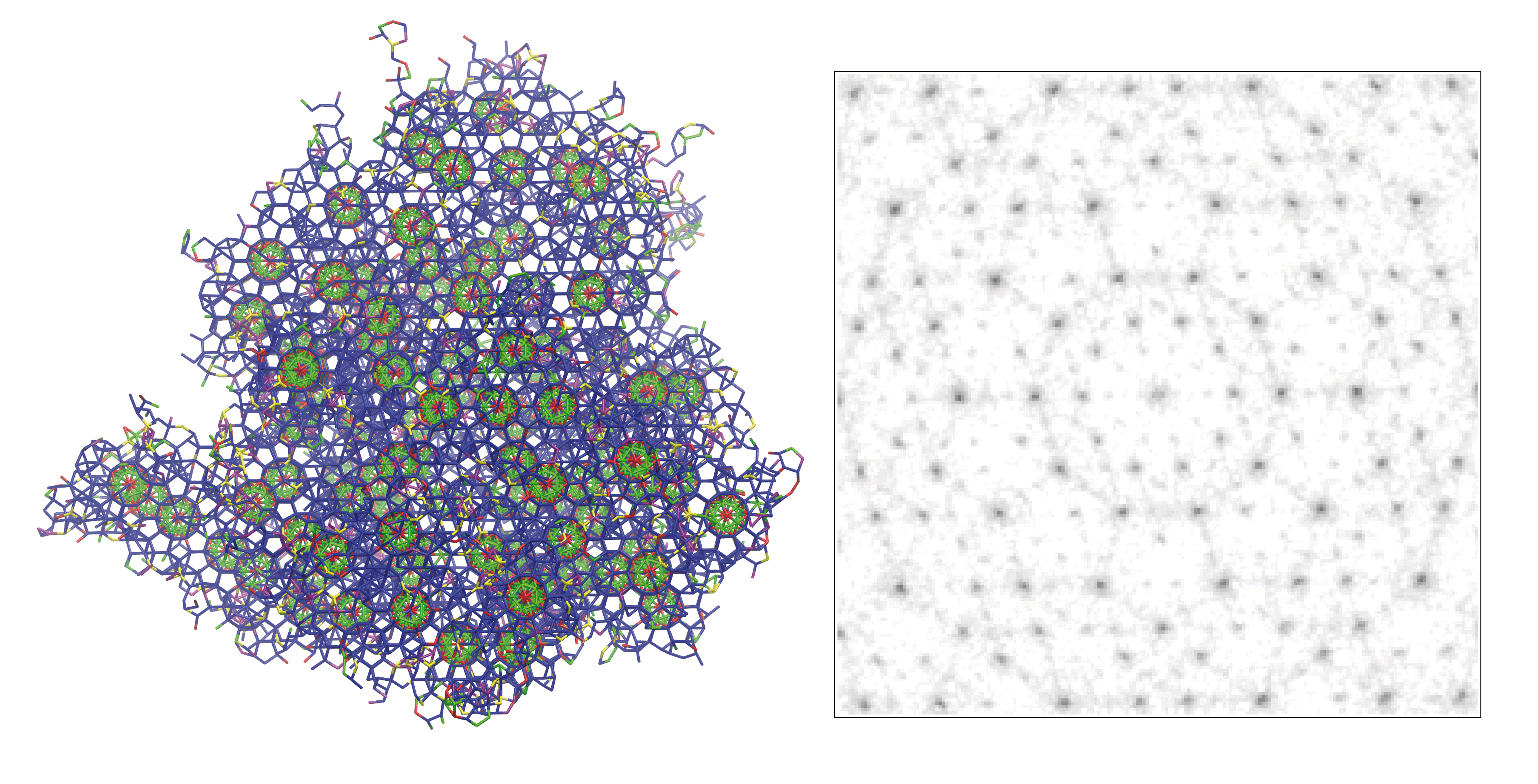 In June 2018 Jon and I met again at a conference in the Czech Republic. We looked once more at the structures of perfect ideal IQCs and of their rational approximants. The latter are periodic structures with similar local environments to the IQCs and that can also be produced from projection from a higher-dimensional lattice but selecting rational cuts. We then realized that perhaps the approximants could be a good starting point for designing the model particles: they have similar repeating units to those found in the IQC but the amount of information is significantly reduced by its periodicity. That decision put us on the right path. The chosen approximant had seven local environments, but we designed a model with “only” five particle types that represented all the local environments, accepting that sometimes these particles might have some dangling bonds. Only a few months later, in November that same year, we assembled for the first time a seemingly aperiodic ordered structure. Pablo Llombart (a PhD student in my group) calculated the diffraction pattern of that structure (Figure 1). That it indeed showed perfect five-fold symmetry axes provided the definitive confirmation! Building an IQC with patchy particles was indeed possible! That was surely the happiest moment of my entire scientific career. The solution was that not all particles needed to be fully bonded, and all that was needed is that the bonds that formed propagated the icosahedral symmetry.