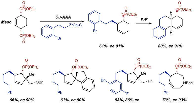 We were curious to explore the limits of desymmetrization in the asymmetric addition of nucleophiles via allylic alkylation. Previous work in this area consisted of addition to very simple meso compounds with stabilized nucleophiles using Pd-catalysis or unstabilized nucleophiles using Cu-catalysis. We noticed that previous Cu-catalyzed methods required the use of highly reactive organometallic reagents at cryogenic temperatures, which limits the nature of the nucleophile significantly. In addition, desymmetrizations of this kind were only applied to very basic substrates.