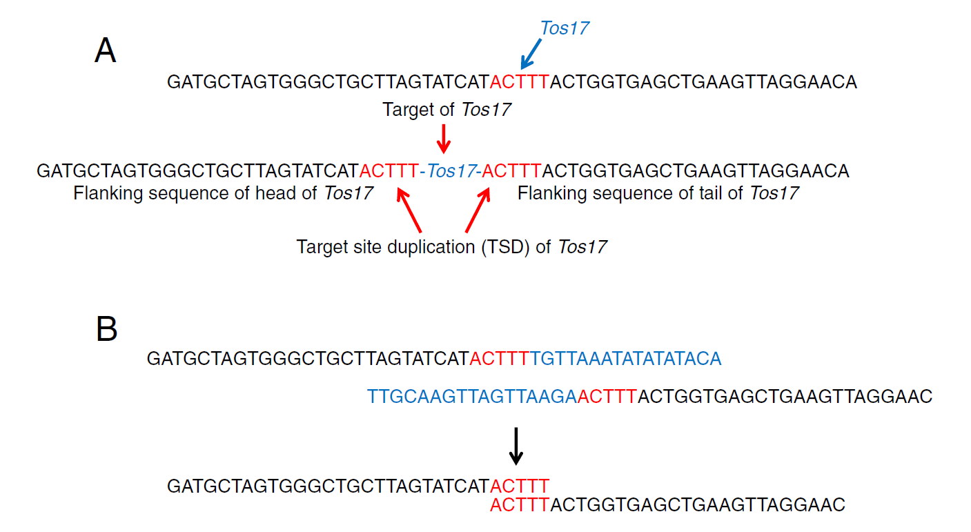 Figure 1A shows the TSD associated with the Tos17 retrotransposon, which was my focus at the time. When Tos17 inserts, a 5-base duplication appears flanking its upstream and downstream ends.