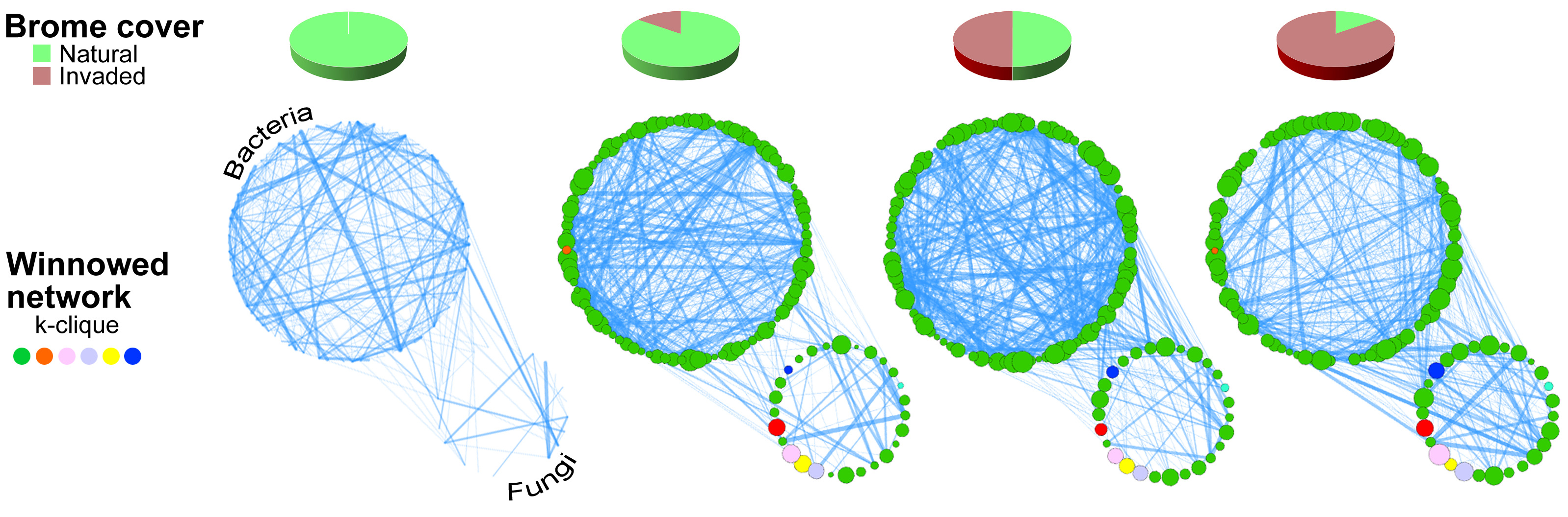 What did we find? Analyzing the winnowed microbial community across a gradient of smooth brome invasion, we found that core microbial networks became more connected as smooth brome become more dominant. What this means for invaded grasslands is this: the relationships that form as smooth brome invades are strong and likely represent a new equilibrium for grassland communities. Smooth brome is there to stay.