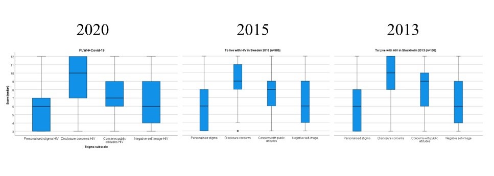 Figure 2. HIV stigma levels in three different cohorts people living with HIV in Sweden collected 2013, 2015 and 2020 (comparison unpublished). Each stigma domain subscale could have a score ranging from 3-12, higher scores mean higher levels of experienced stigma.