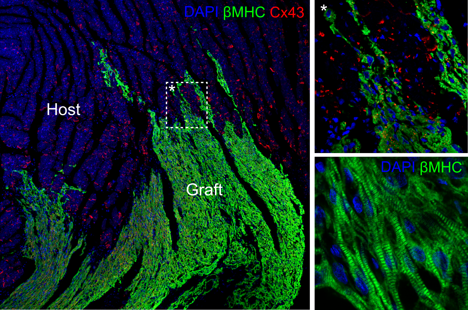 Figure 1: Cardiac grafts in infarcted rat hearts transplanted with hESC-epicardial cells and cardiomyocytes. Electrical gap junctions are shown in red. (*) exhibits a magnified area in the top right panel, whereas the bottom right panel displays the ultrastructure of the cardiac grafts.