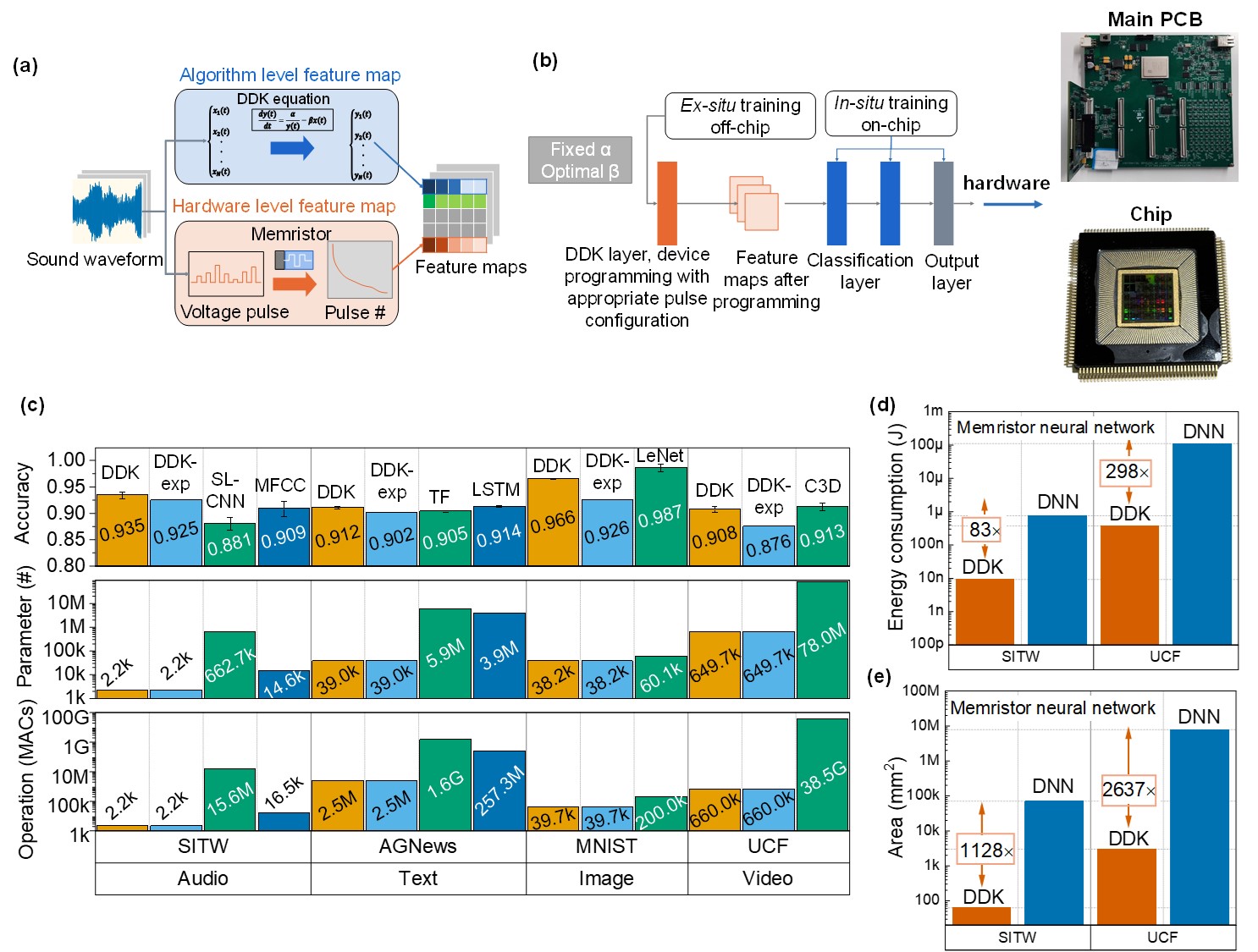Figure 1 (a) Feature learning approach leveraging the drift-diffusion kinetics of computing-in-memory devices. (b) Hybrid training approach for neural networks and the hardware system employed in the experiments. (c) Performance comparison of this approach with other feature learning techniques across speech, text, image, video, and 3D object recognition tasks. Hardware energy consumption (d) and chip area (e) comparison between the memristor-based DDK network and the memristor-based DNN.