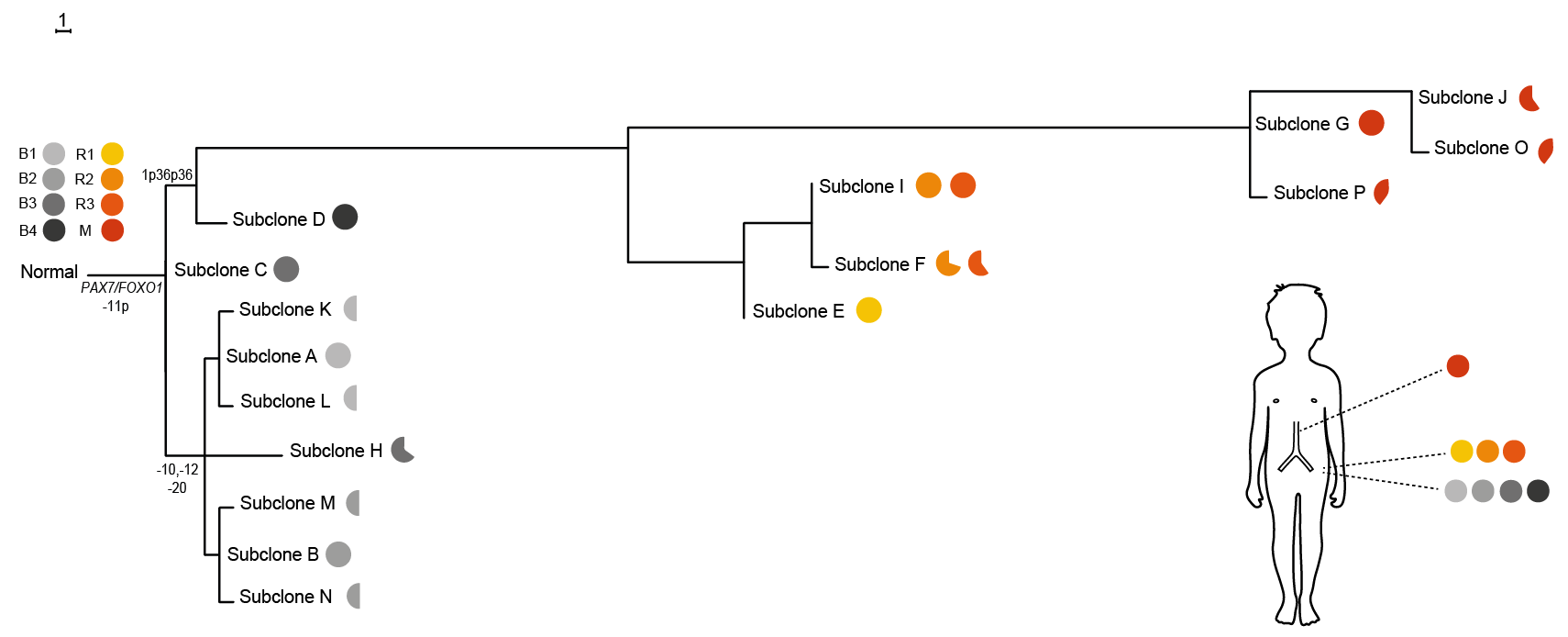 Figure 1 An example of a phylogenetic tree produced by DEVOLUTION for a rhabdomyosarcoma (muscle tumor). The filled pies to the left illustrate which biopsies are available from this patient, i.e. 4 biopsies from the primary tumor (B), 3 biopsies from the local relapse (R) and one biopsy from a metastasis (M). The endpoints represent different subclones, whose fraction per sample are visualized by pie charts. The scale bar indicates the distance corresponding to one genetic aberration. Here the relapse and metastasis form their own branch harboring several additional genetic alterations compared with the primary tumor.