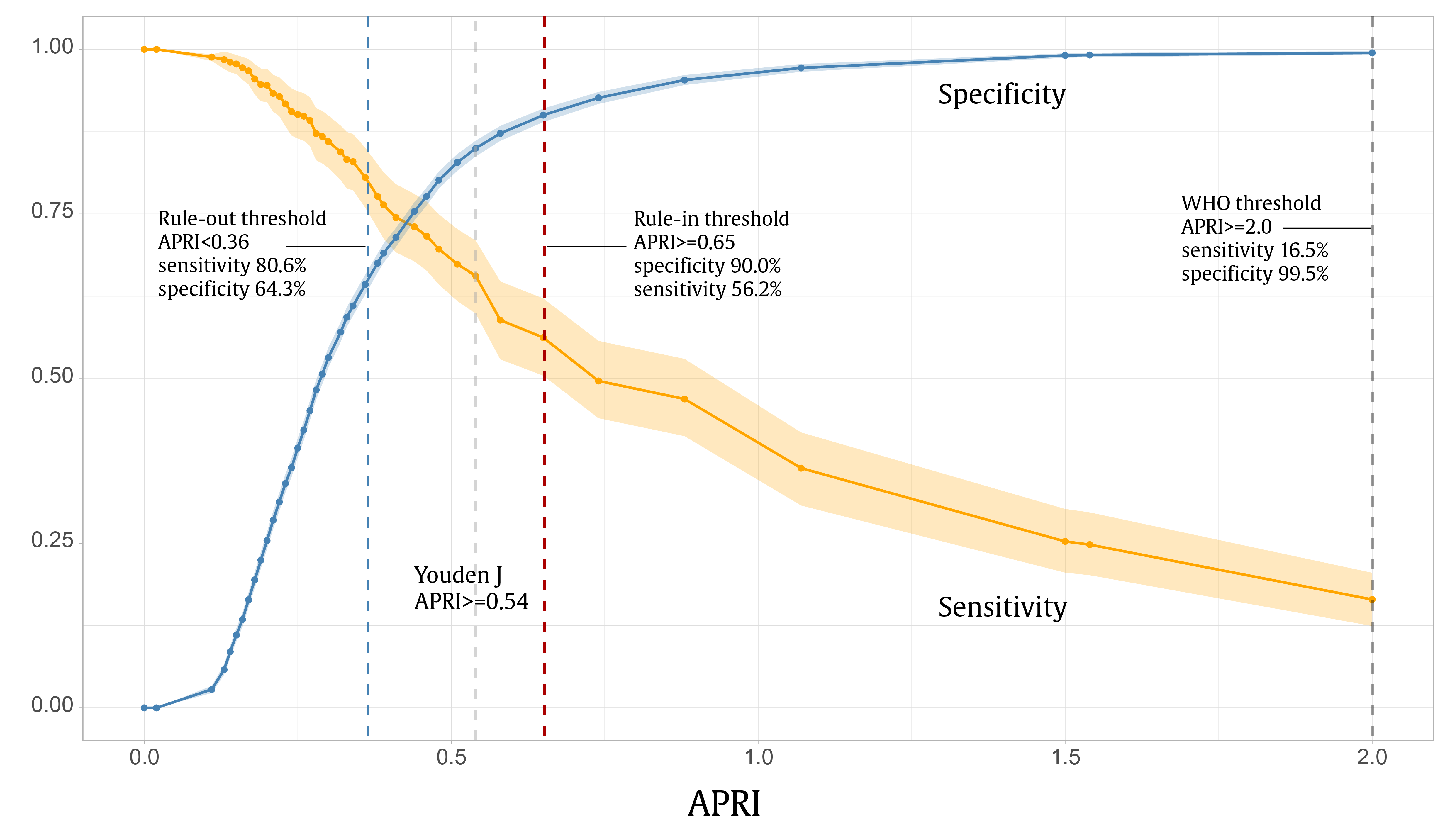 We confirmed earlier findings that showed a poor sensitivity using the WHO recommended APRI threshold of 2.0; only 16.5% of patients with cirrhosis (liver stiffness >12.2kPa) had an APRI score above this threshold and would receive treatment by applying the WHO 2015 guidelines. We developed new APRI thresholds with improved sensitivity: at a “rule-in” threshold of 0.65 the sensitivity was improved to 56% with high specificity; at a “rule-out” threshold of 0.36 sensitivity was 81% but with a lower specificity (Figure).