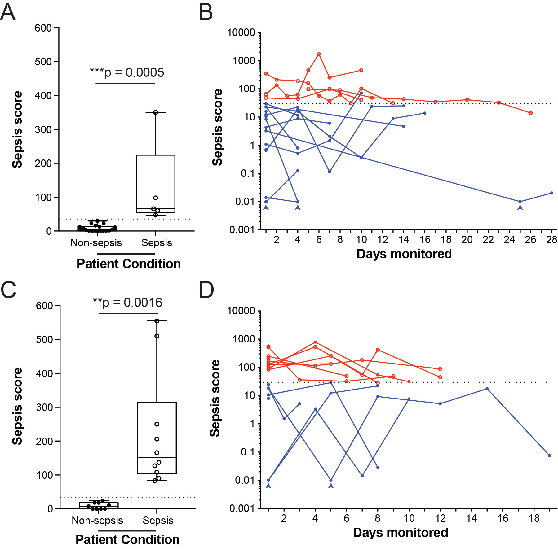 Figure 1. Identification of samples from patients with sepsis using the Sepsis Score. A) The sepsis score identified sepsis with 100% accuracy in day 1 samples from the Derivation cohort. B) Sepsis scores from patients with (red lines and symbols) and without (blue lines and symbols) sepsis followed over time in the Derivation Cohort. C) The sepsis score also identified sepsis with 100% accuracy in day 1 samples from the Validation cohort. D) Sepsis scores for patients followed over time in the Validation cohort. Figure adapted from our paper; Macmillan Publishers.