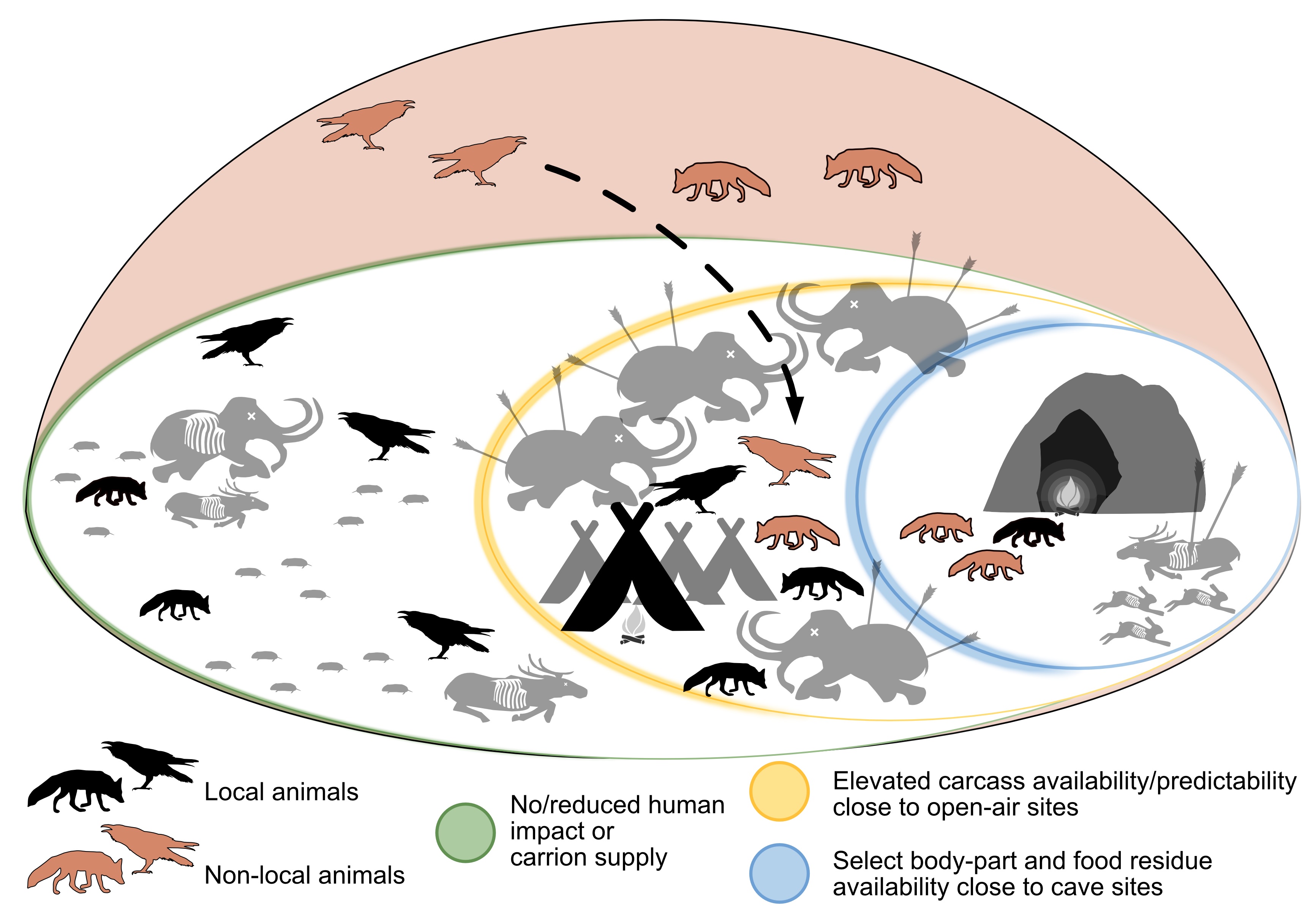 In total, our research draws attention to the involvement of some Upper Palaeolithic hunter-gatherers in the manipulation of carrion supply dynamics already 30,000 years ago. Such manipulation, in turn, provided unique conditions for some early adopter animals such as ravens to ‘colonize’ these human-shaped landscapes and to prosper in them. By constructing specific micro-ecologies, past human foragers drew ravens into their activity sphere and thereby developed new forms of relationships with them. Humans and ravens were strongly exposed to each other, and ravens became a regular and integral part of people’s everyday experiences. As a result, ravens also became culturally important for Pavlovian people, and this is reflected in the extraction and use of their feathers. The consistent association of ravens with dead animals at the periphery of human domestic spaces thereby helped to shape particular understandings of the birds, some of which may still resonate in some circumarctic cosmologies today, where ravens are often regarded as important transformative agents, ‘tricksters’ or ‘world-makers’. The form of coexistence between humans and ravens observed during the Pavlovian at least seems to have resulted in both species orienting their behaviours towards each other, and we suggest that the Pavlovian is therefore a good model system for better understanding the relationship between human ecosystem impact and animal behavioural responses that ultimately underpins much Anthropocene unease in the face of returning wildlife. Archaeologists hold some of the knowledge that is relevant here and archaeological research can thus critically contribute to the development of viable and sustainable forms of human-wildlife coexistence in the present and future.