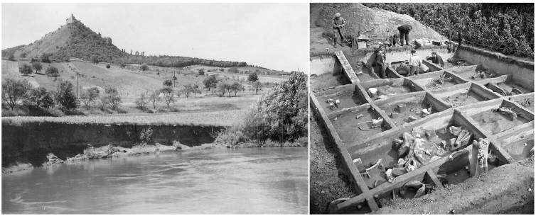 Left: view from the Dyje river to Dolní Věstonice 1 with the Pavlovian Hills in the background. Photography by A. Bohmers, approximately 1941/42; archive of the Moravian Museum, Brno. Right: excavations at Pavlov 1 led by B. Klíma in 1957. Photograph by K. O. Hrubý; archive of the Moravian Museum, Brno.