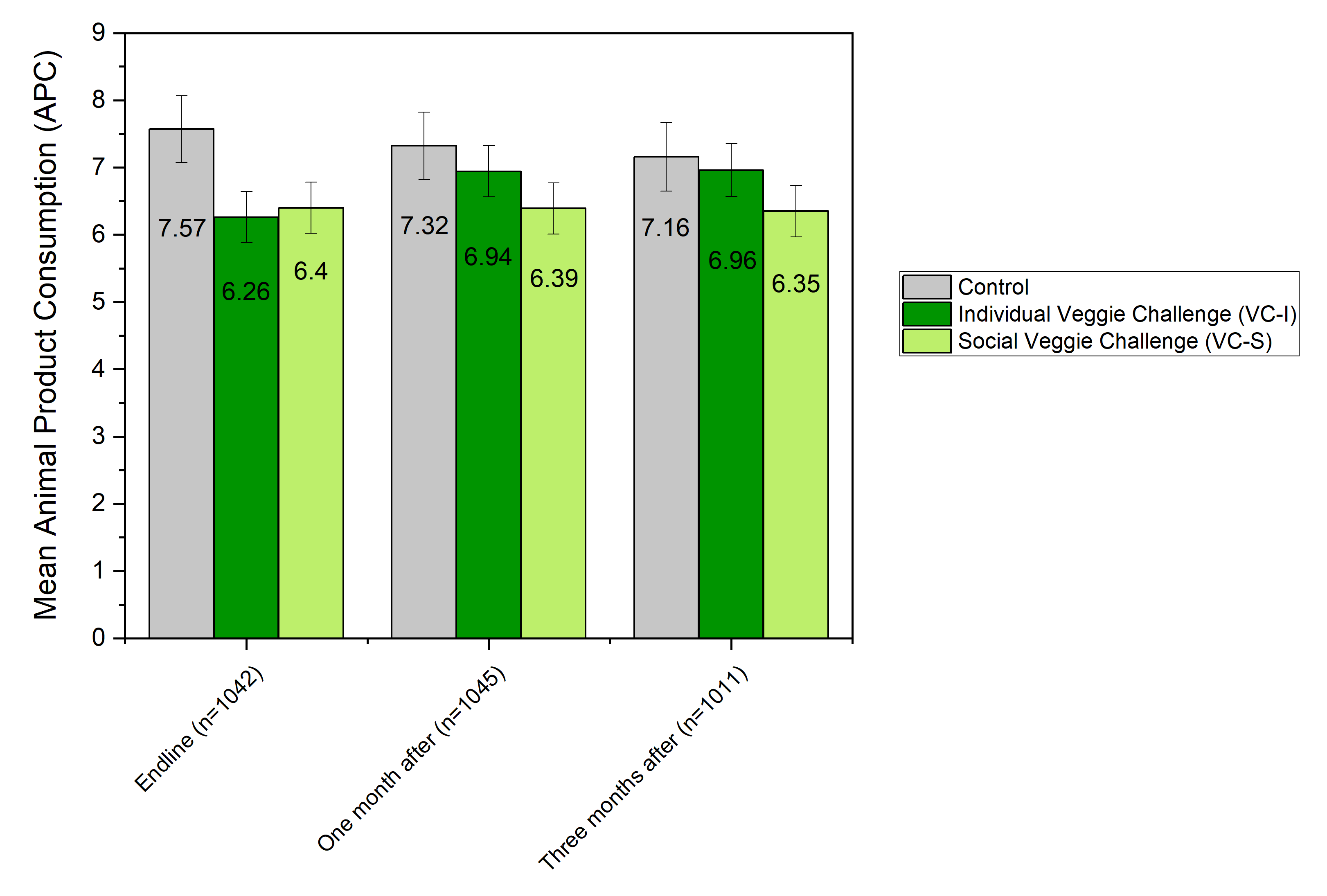 Right after the intervention, both the individual and the social treatment were equally effective in reducing animal product consumption (16-17% reduction compared to the control group). This was different at later measurements: 1 month after the intervention, the individual treatment group bounced back, almost to the level of the control group. The effect of the social treatment however remained significant, also 3 months after the intervention. When zooming in on meat consumption only, the effects are larger with an initial reduction of 22-27%, and a durable reduction of 25% for the social treatment 3 months after the intervention.