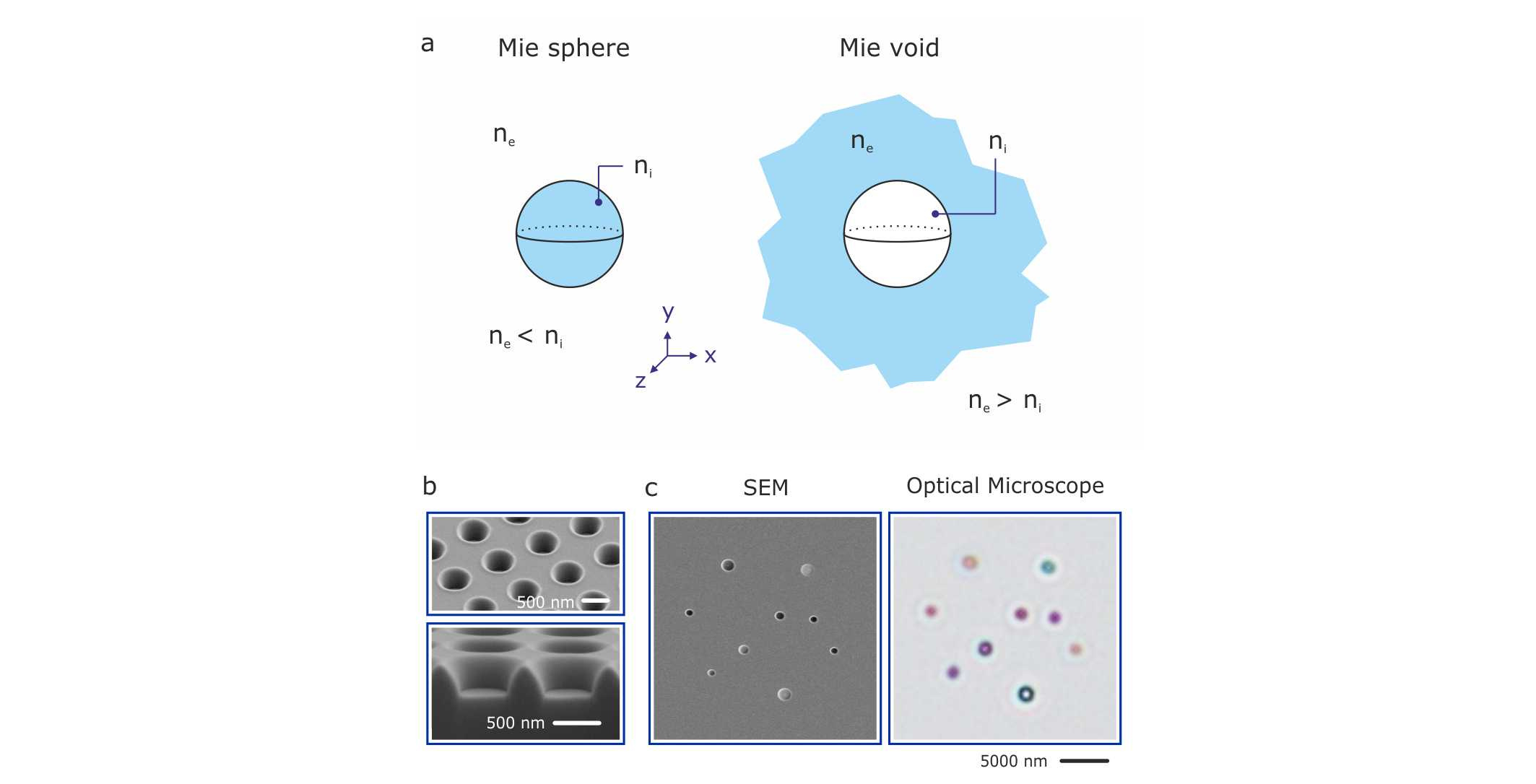 How does one implement such Mie voids experimentally? Instead of creating voids inside a bulk material which is highly absorptive, we bring the voids to the surface and create cylindrical voids in a standard silicon wafer by FIB milling, which is depicted in the SEM images in Figure 1b. Figure 1c displays scanning electron and optical microscope images of individual voids with different depth and diameter. The optical image illustrates the resonant optical behaviour of the voids, showing brilliant colours in reflection.