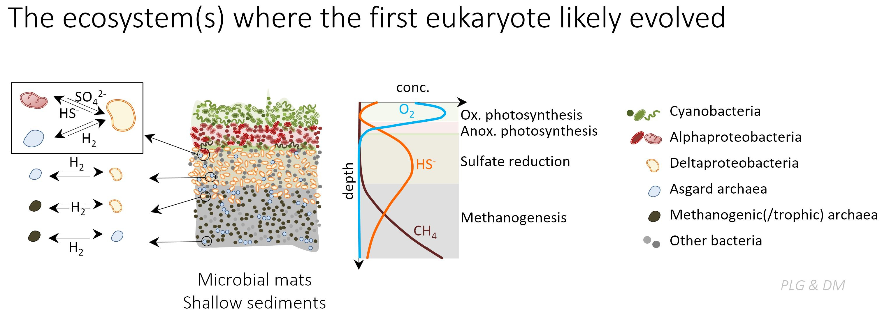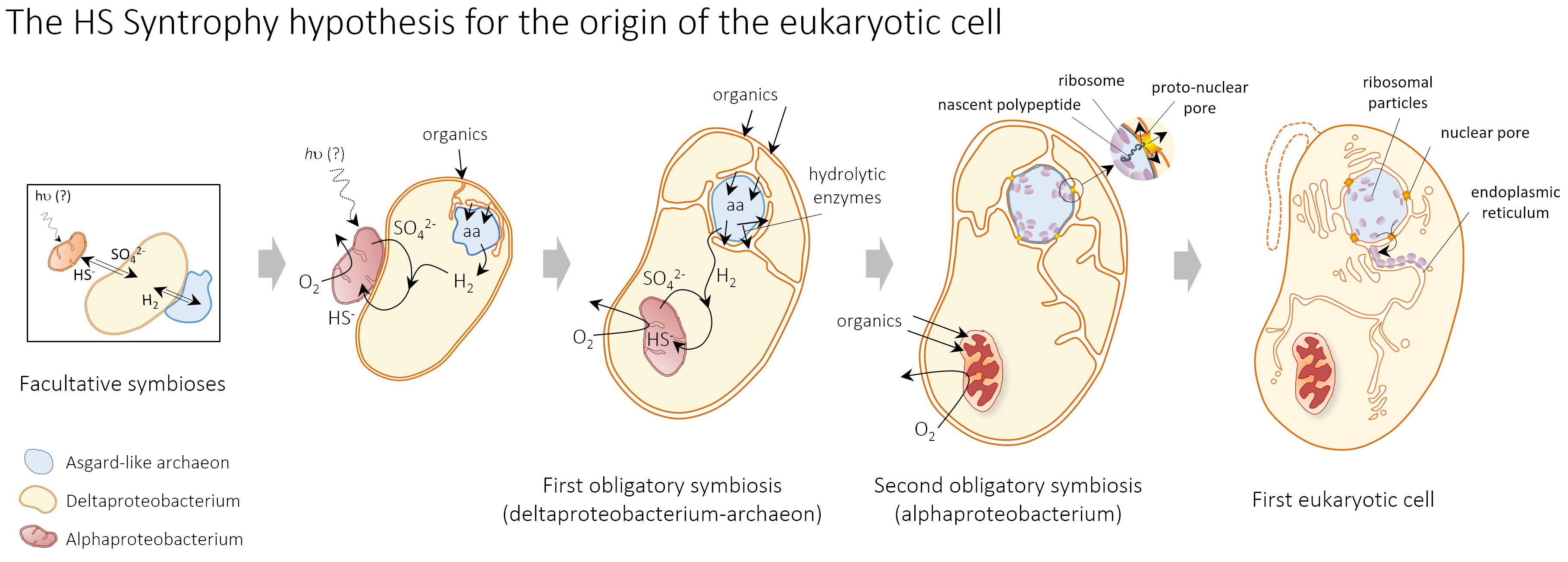 This strongly revitalizes early models proposing a hydrogen-based syntrophy at the origin of eukaryotes. One of such models was the Syntrophy hypothesis (1998) which, based on solid microbial ecology grounds, postulated that eukaryotes derived from the endosymbiosis of a methanogenic archaeon within a fermentative deltaproteobacterium from which it scavenged hydrogen before a versatile aerobic and methanotrophic alphaproteobacterium joined the consortium. However, the discovery of Asgard archaea imposes new constraints on eukaryogenetic models. In this new context and based on well-known microbial ecological interactions in redox transition environments, we have updated the Syntrophy hypothesis (https://www.nature.com/article...), making the inter-partner metabolic exchange shift from a hydrogen-and-methane (HM) transfer towards a hydrogen-and sulfur-species (HS) transfer.