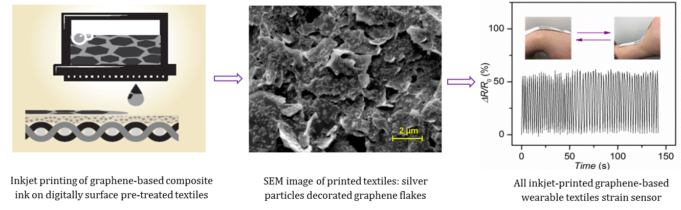 Digital fabrication of wearable devices via inkjet printing is of great interest due to a number of advantages over conventional manufacturing techniques such as digital and additive patterning, reduction in material waste, deposition of a controlled quantity of materials and compatibility with various substrates. Moreover, the use of new exciting and multi-functional materials such as graphene in composite inkjet inks could be more sustainable approach, as it reduces the consumption of expensive metal inks and saves energy due to lower processing temperature of graphene-based formulations as opposed to higher sintering temp of metallic inks.