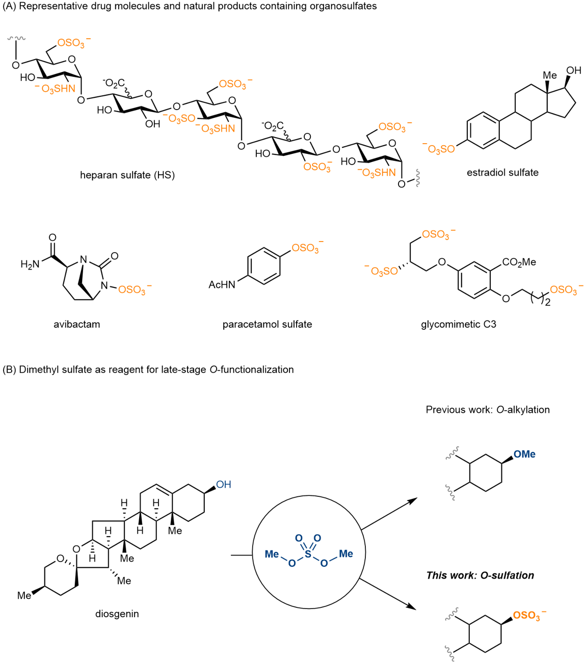 O-Sulfation is a vital post-translational modification, which occurs in a diverse range of biomolecules, including polysaccharides, peptides, proteins, natural products and drug metabolites. It has significant implications in developmental biology, immunology, and neurobiology, as well as disease processes. Introducing sulfate group into the biomolecules could change their specific and non-specific recognition via electrostatic or hydrogen bonding interactios. Therefore, appropriately designed non-natural sulfated scaffolds expand their structural diversity and provide valuable insights into a wide range of biological functions. However, chemical synthesis of sulfated molecules remains challenging due to their lability to acid and temperature, insolubility in nearly all organic solvents, and limited maneuverability following introduction. Traditionally, H2SO4 has been successfully applied to straightforward alkenes and alcohols, but it is unsuitable for compounds containing delicate functional groups due to the strong acidity. Sulfur trioxide-nitrogen base complexes are the most commonly used reagents for sulfating various molecular motifs, but abrasive and severe conditions could constrain their synthetic adaptability. Therefore, it is of great significance to develop a general and robust approach to realize the O-sulfation.