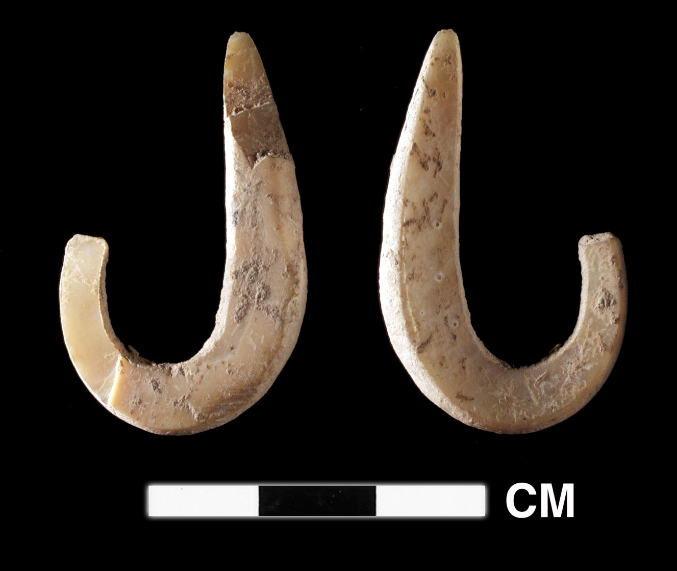 Figure 2. Shell fish hook recovered from the site of Lene Hara dating to 11,000 years ago. An earlier, less complete example was recovered from Asitau Kuru, indicating an early marine specialization for humans arriving on these islands.Photograph taken by Sue O’Connor.