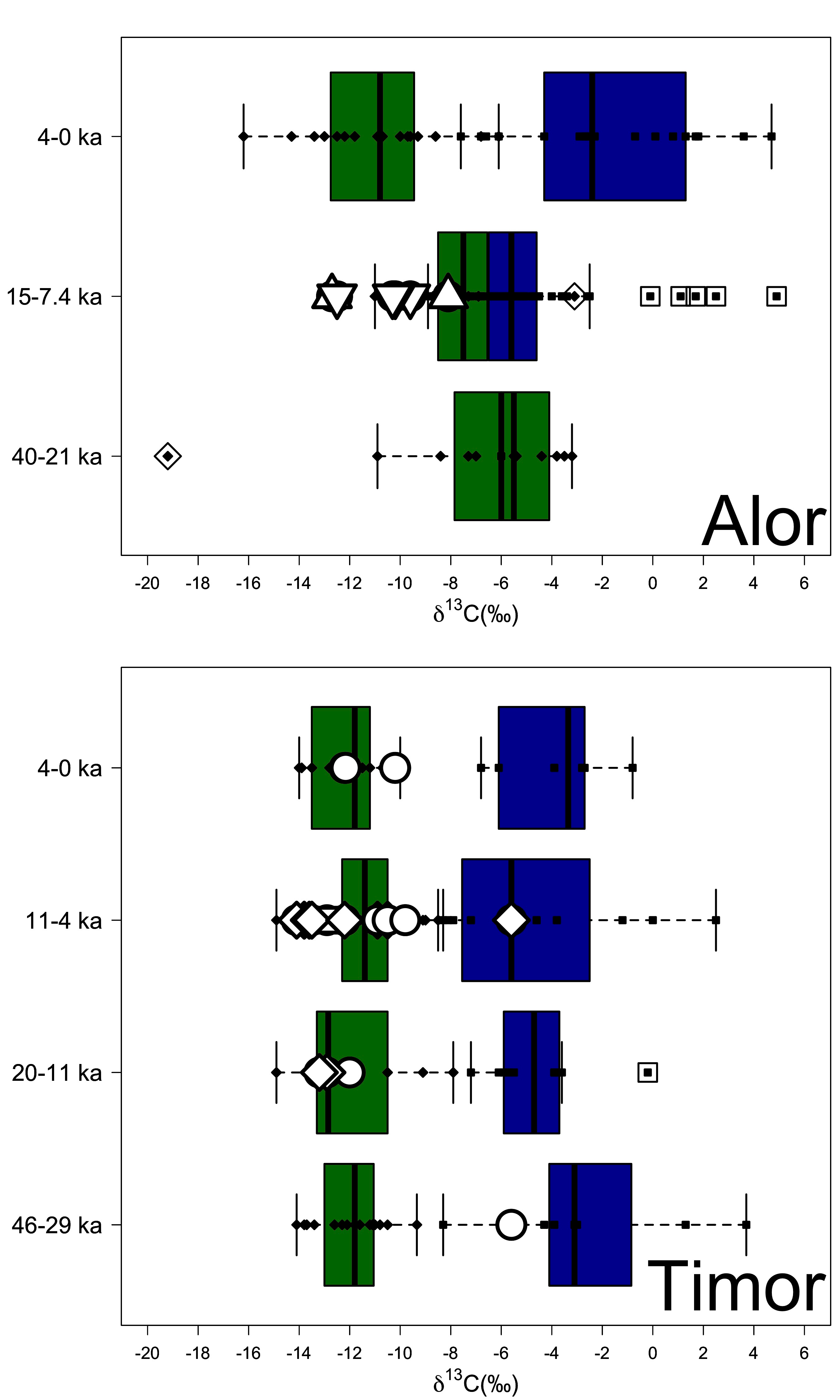 Figure 5. Stable carbon isotope measurements from human and animal tooth enamel from the islands of Alor and Timor analyzed in this study. Data shown by Phases developed on the basis of existing and published stratigraphic and chronological information. Human samples are shown as white symbols depending on site (Circle = Asitau Kuru; Diamond = Matja Kuru 1 and 2; Square = Lene Hara; Triangle = Makpan; Inverted Triangle = Tron Bon Lei).