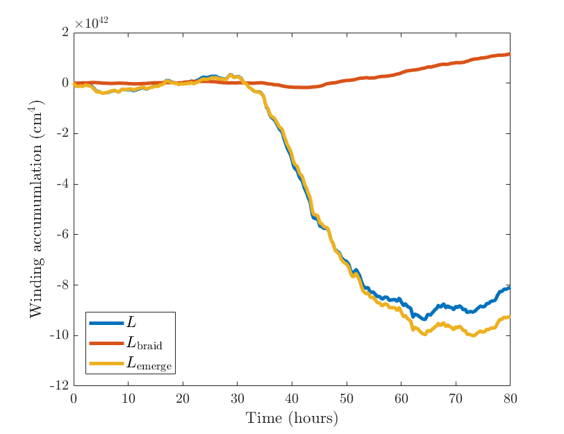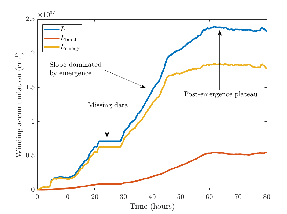 Figure 1(a) shows field lines of an emerging twisted tube below and above the photospheric boundary (shown in red). There is no visible resemblance to a twisted flux tube due to the strong deformations caused by convective motion and the emergence into the atmosphere. That being said, the magnetic winding is robust enough to still detect that the magnetic field has a net twist, and this can be seen in Figure 1(b), which shows the accumulations of the total magnetic winding L, as well as the contributions to magnetic winding due to emergence, Lemerge, and photospheric braiding motions, Lbraid. What this signature is saying is that when the bulk of the twisted tube rises above the photosphere, it remains there. Even though convection drags down part of this field, no more topologically-significant field is passing through the photosphere. Thus, after the rise during emergence, there is a plateau which indicates that the main topological content has passed through the photospheric boundary (where the calculations are performed). Further, Lemerge dominates the contribution to L, which means that the signature is dominated by a pre-twisted magnetic field, rather than one whose twist is generated later by photospheric motions.