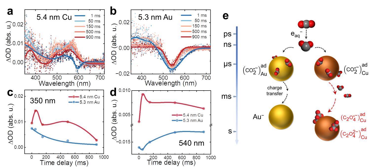 Fig. 2 │Transient absorption profiles at second timescale. a-b, Transient absorption spectra of surface-bound radicals at 1 ms, 50 ms, 150 ms, 500 ms, and 900 ms in the presence of 0.5 mM 5.4 nm Cu (a) and 5.3 nm Au (b). c-d, The curves of ΔO.D. versus time delay at 350 nm (c) and 540 nm (d). e, Schematic diagram of the generation, stabilization, and conversion of CO2•− radicals in the presence of Au and Cu NP. CO2 reacted with eaq– to form CO2•– within a few nanoseconds, and the CO2•− radicals stabilized on the surface of Cu and Au NPs. After 1 ms, surface-bound radicals were converted to dimer intermediates, and surface-bound radicals decayed for around 150 ms. For simplicity, cations are not shown.