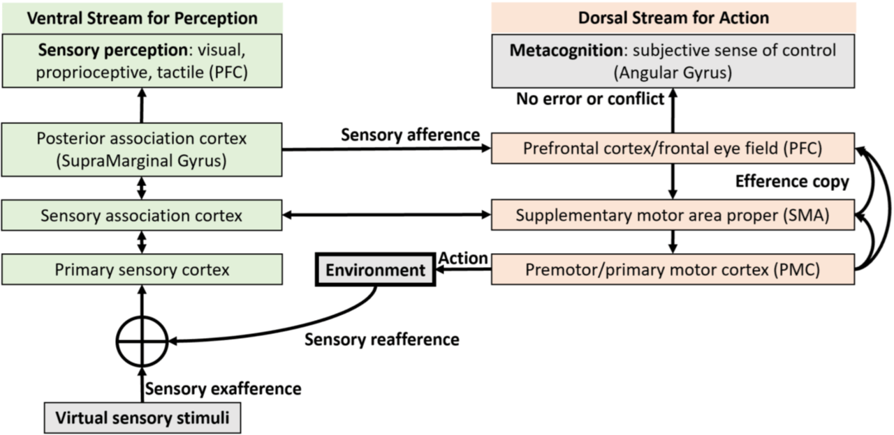 The insights from our study [1] are crucial for not only validating medical simulation technology but also for facilitating skill training in an augmented (AR, MR) simulation environment where virtual sensory stimulation (sensory exafference) can be provided to the ventral stream (figure 2) for ‘bottom-up’ attention for perception [4]. Notably, a lack of subjective sense of control and sensory conflict may trigger the stress response and cybersickness where brain-behavior analysis of various conflict-reducing sensory exafference can help, e.g., fading transitions, blurring, etc. Moreover, sensory exafference under portable brain imaging can be used for motion sickness conditioning, operant conditioning with a disproportionate weighting of feedback [5] as well as explicit stimulus-reward pairing via the ventral stream for the perception that needs investigation in XR simulation training. Then, non-invasive brain stimulation (NIBS) in conjunction with brain-behavior analysis [6] can establish causality of the corresponding brain regions, e.g., by disruption with NIBS [7], as well as can facilitate skill learning [8], e.g., with NIBS of ‘top-down’ executive control [9],[10] from the prefrontal cortex/frontal eye field to the superior parietal lobule of the posterior association cortex [4].