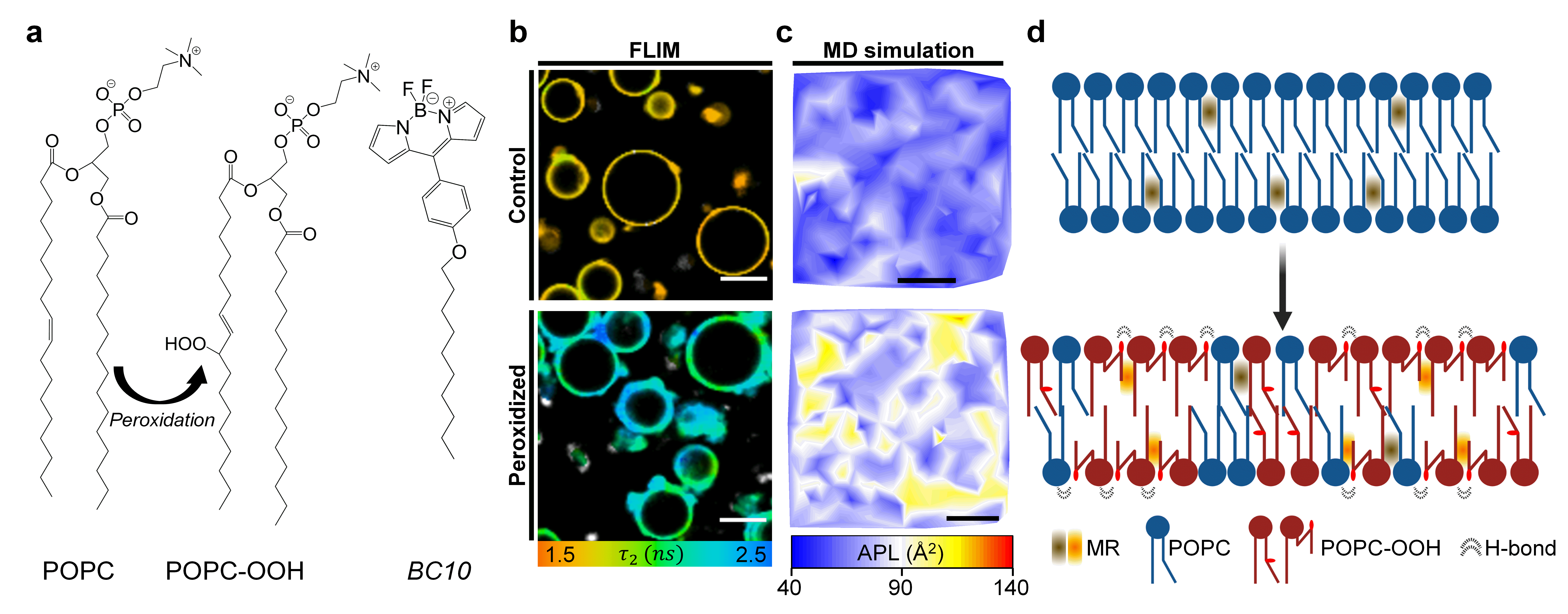 Figure 1. a, Molecular structure of the lipids and molecular rotor BC10 used in this work. More viscous environment will result in an increased lifetime from BC10 b, Fluorescence Lifetime Imaging Microscopy (FLIM) revealed an increase in the membrane’s viscosity and lateral heterogeneity in the presence of lipid peroxides. c, MD simulations confirmed the formation of lipid clusters with distinct molecular configuration, here exemplified by changes in the area per lipid (APL). d, A schematic showing the effect of lipid peroxidation on the membrane’s architecture.
