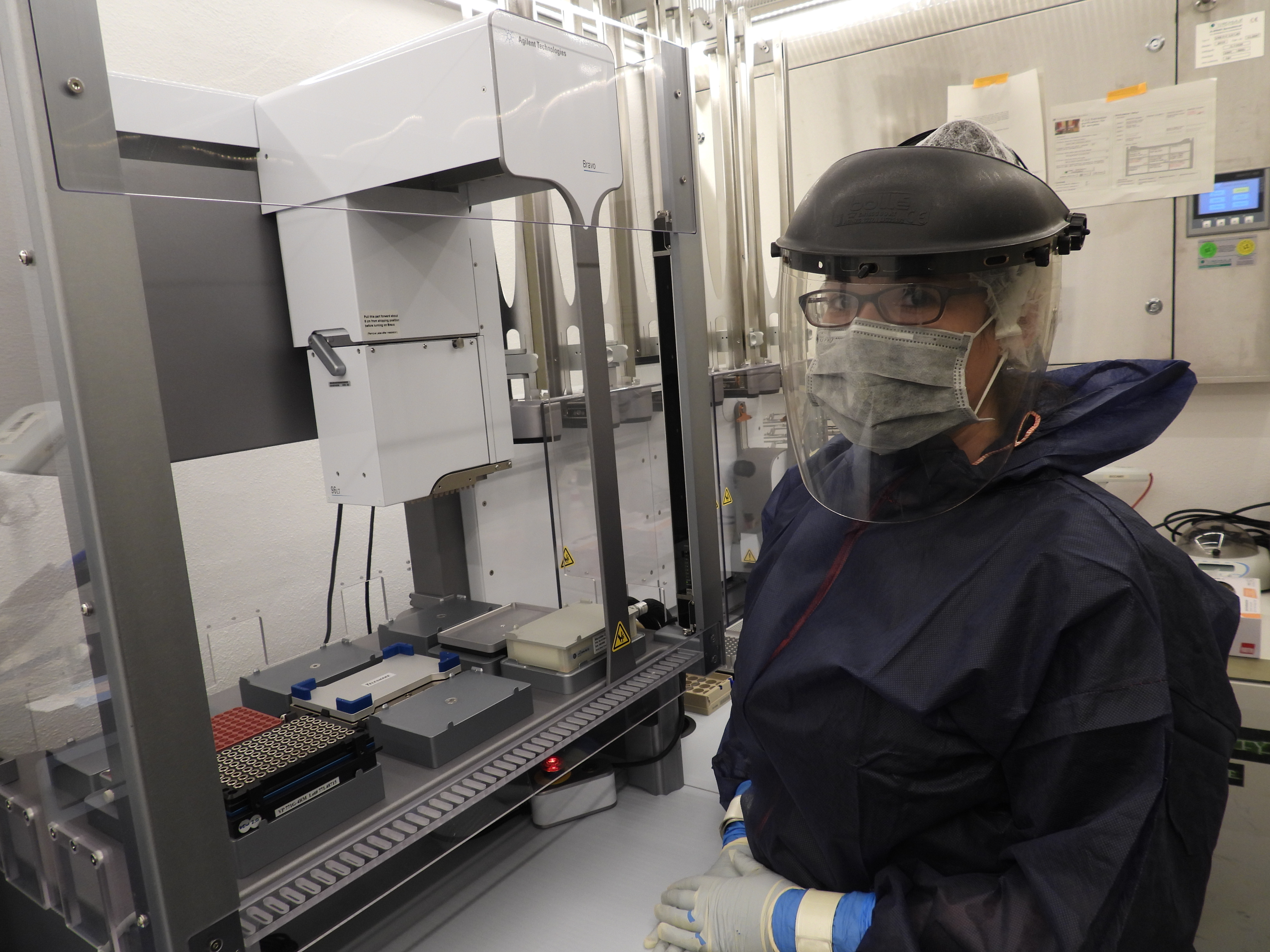 Figure 3: Elena Zavala in clean room gear with the robot used for DNA extractions and library preparations (photo credit: Mateja Hajdinjak)